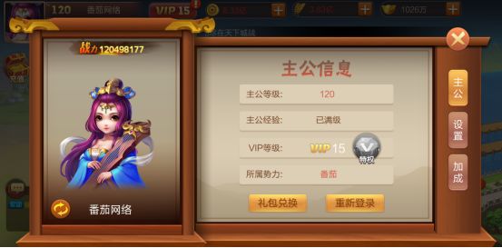 主界面左上角展示玩家名称、等级、经验条及VIP等级,点击头像会弹出系统设置界面,可在此处修改头像,兑换礼包,开启或关闭音乐音效。