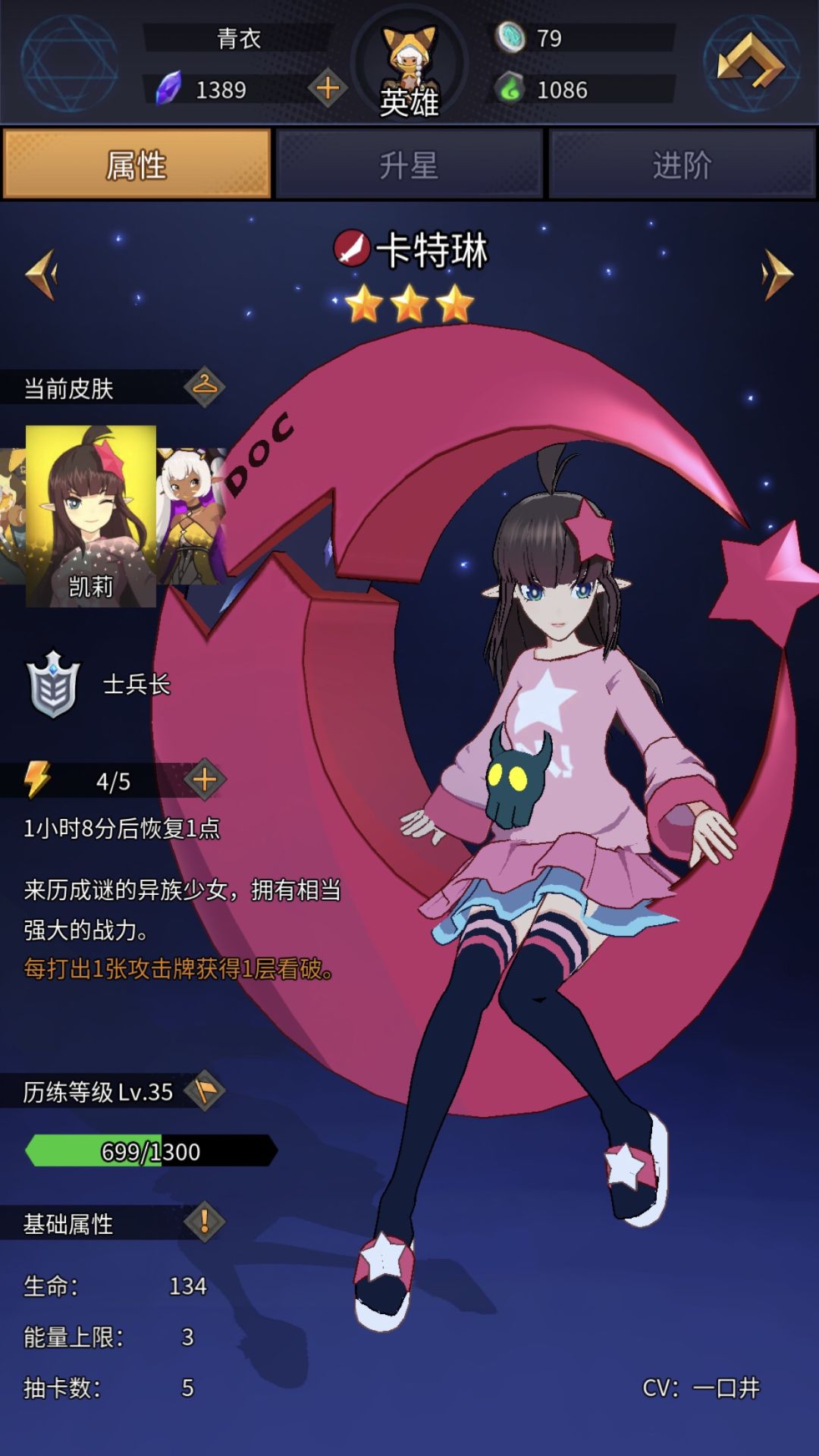 这就是这个号的基本情况了!现在说说卡牌搭配的攻略吧!卡特琳,迪恩,伊米尔!每个角色说两种组合。首先先说突击队的卡特琳,作为刚刚开始就拥有的游戏角色,各位玩家应该是最熟悉不过的了!人物特殊buff不多说了,看破就对了!