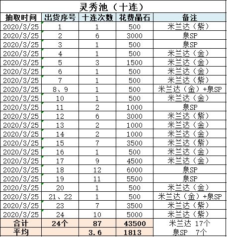89发十连,共花43500石,出货24个,其中米兰达 17个(包括金阶和紫阶),泉SP 7个。