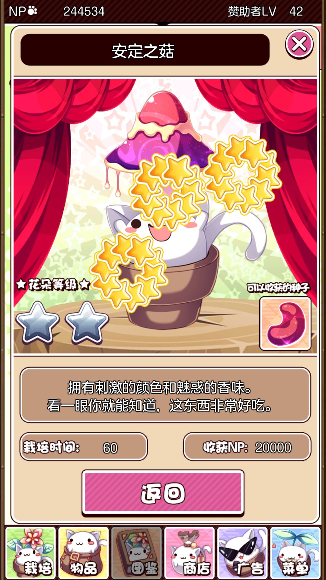 No.16安定之菇,稀有度☆2,魅惑+快速之种,双子三子及提高价值猫粮皆可,加速的花盆,收获lv2改良种x1