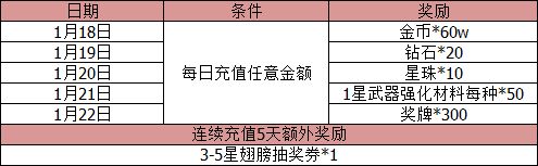 活动内容:活动期间,每日充值任意金额,即可在活动结束后获得对应奖励;连续充值5天,将会额外获得3-5星翅膀抽奖券*1,拼RP的时刻到了,勇士们还不来试试手气!