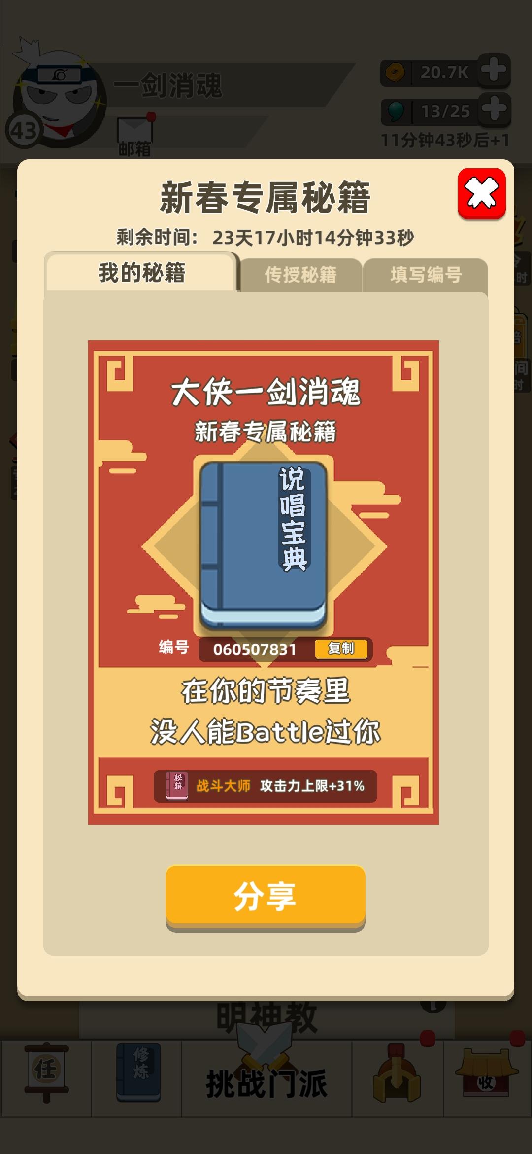 我有一本绝世武功要传授于你!来《我功夫特牛》,输入我的秘籍编号 【060507831】,一起称霸武林!