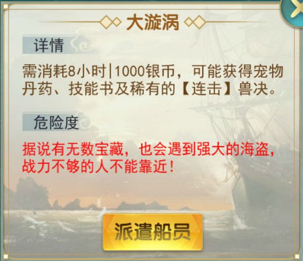 大漩涡:往返消耗8小时,1000银币费用,但90%几率遇到100万-500万战力的海盗,如果派出的船员总战力比遇到的海盗战力低,则航海失败不能获得宝物。大漩涡为固定资源点,永不消逝,可以一直去探索。
