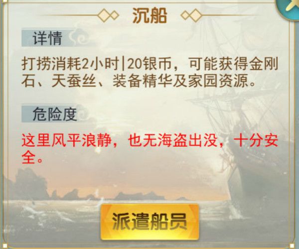 沉船:往返消耗2小时,20银币费用,收获可能是1000木材、1000石材、500口粮、2金刚石、2天蚕丝、装备精华中的一种(概率均等),航行无风险,不会失败,打捞后沉船消失。
