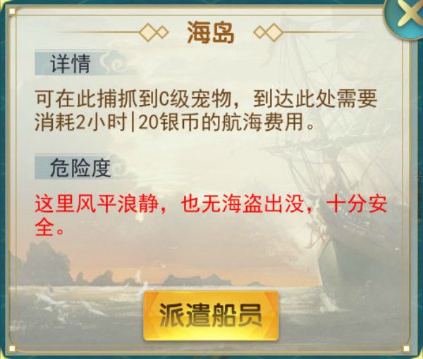往返需消耗2小时时间,20银币费用,收获任意C级宠物,航行无风险,不会失败,可以无限次数前往,不会消失;