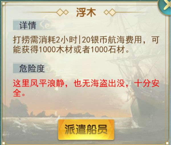 浮木:最低级资源点,往返消耗2小时,20银币费用,收获1000木材或1000石材(概率均等),航行无风险,不会失败,打捞后浮木消失。