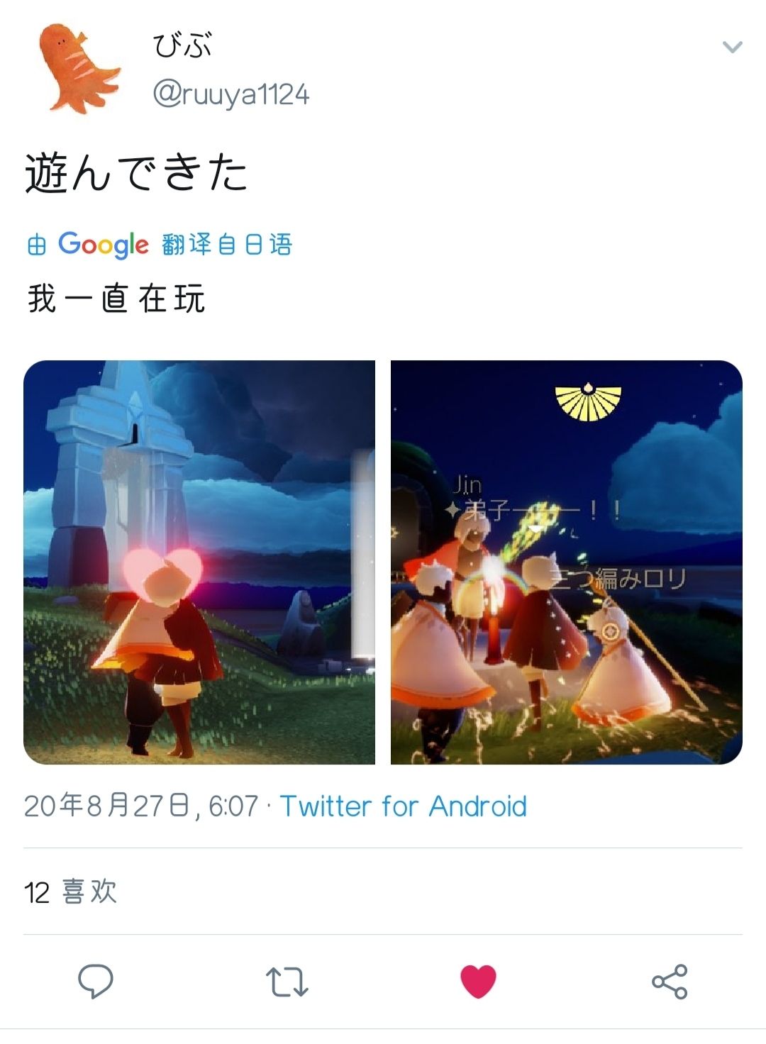 图片来自微博@光遇bot(推特原文没有翻译)