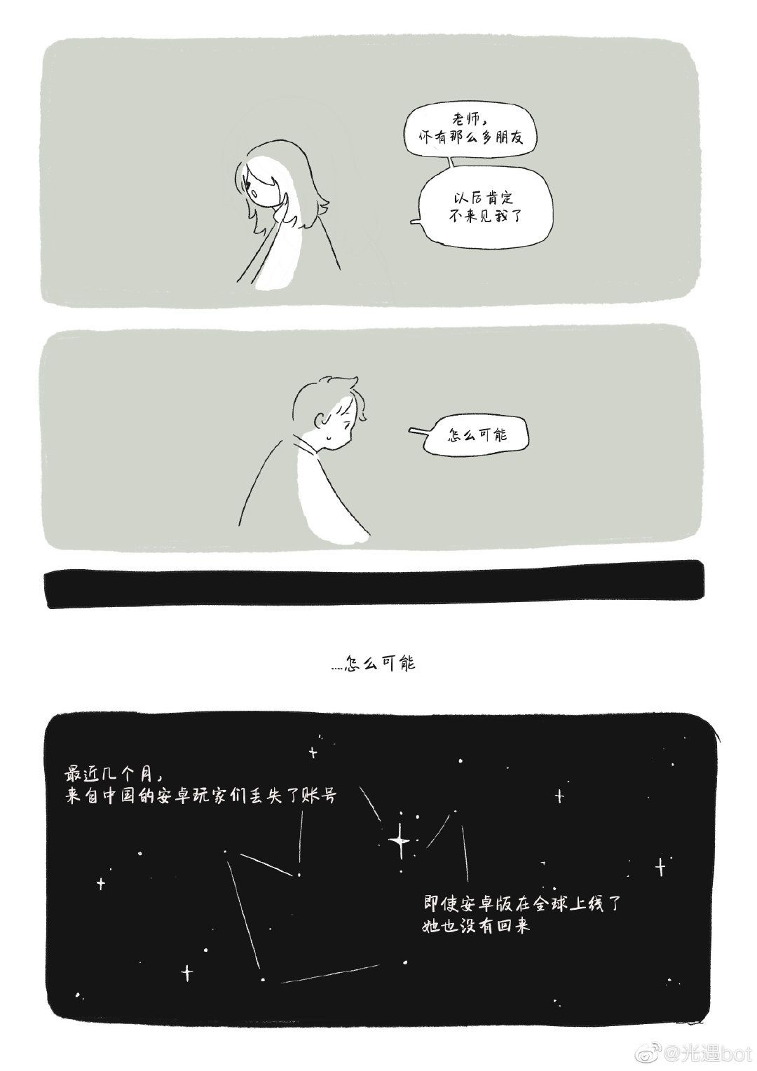 女生可能丢失了国际服的账号数据,很久没有登陆游戏,她的日本朋友非常想念她,画下了这些漫画,希望能再见到这个女生💔