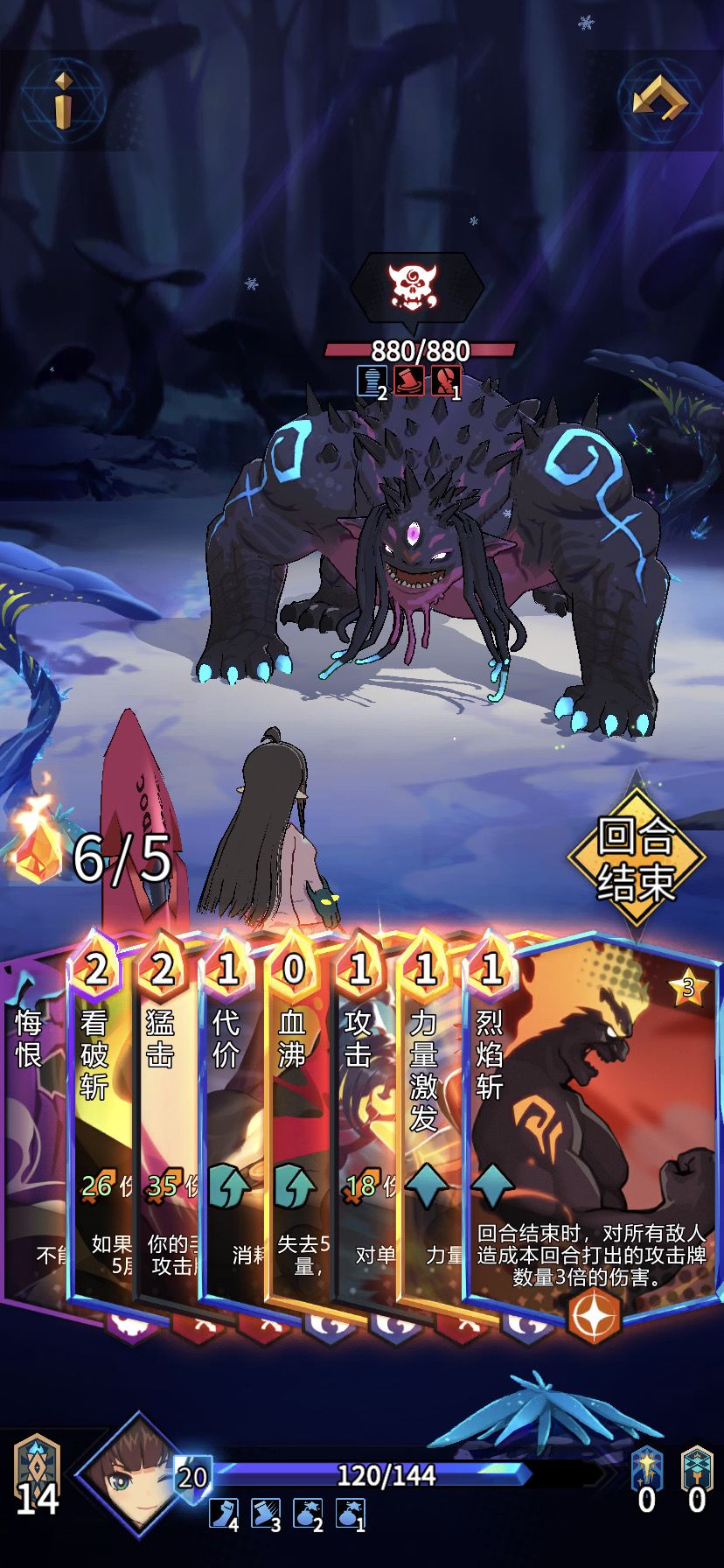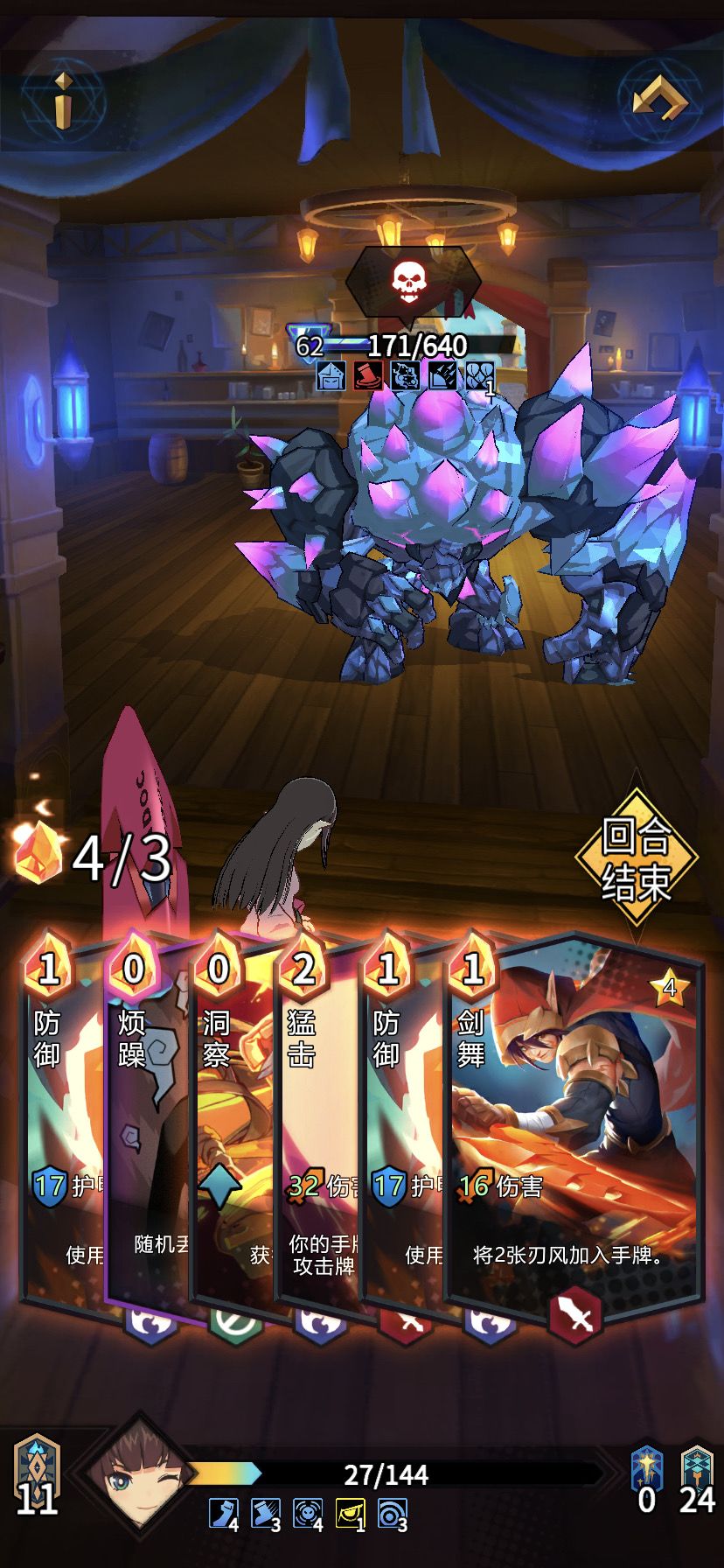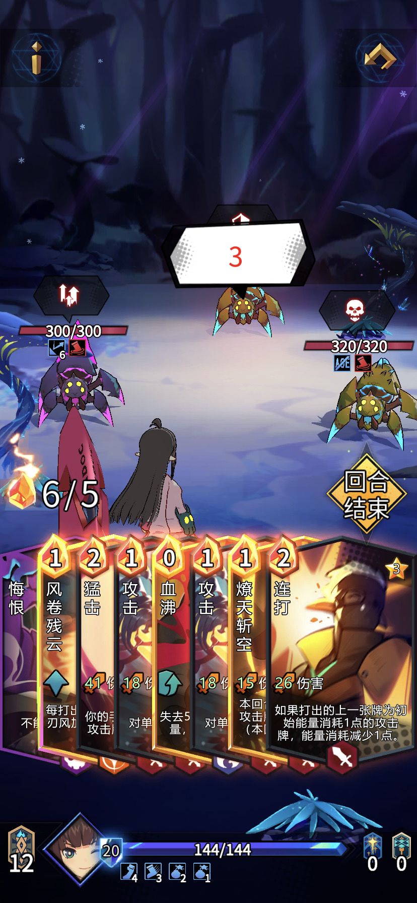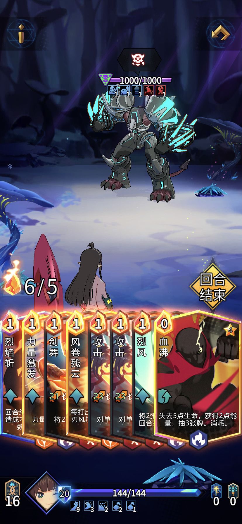 最难打的就是第一关卡,只要熬过第一关卡,后面的2关基本不难了。第一关卡主要是起手难,也有一定的运气成分,主要是摸到多一张“剑舞”,因为这个关卡有一个“迟缓”buff非常适合连击多的角色,只要连击起来伤害才会最大化。所以看到“剑舞”“烈风”一定要拿,过了第一关卡我们的卡牌结构也会相对好一些,所以后面的两层就偏向好打。