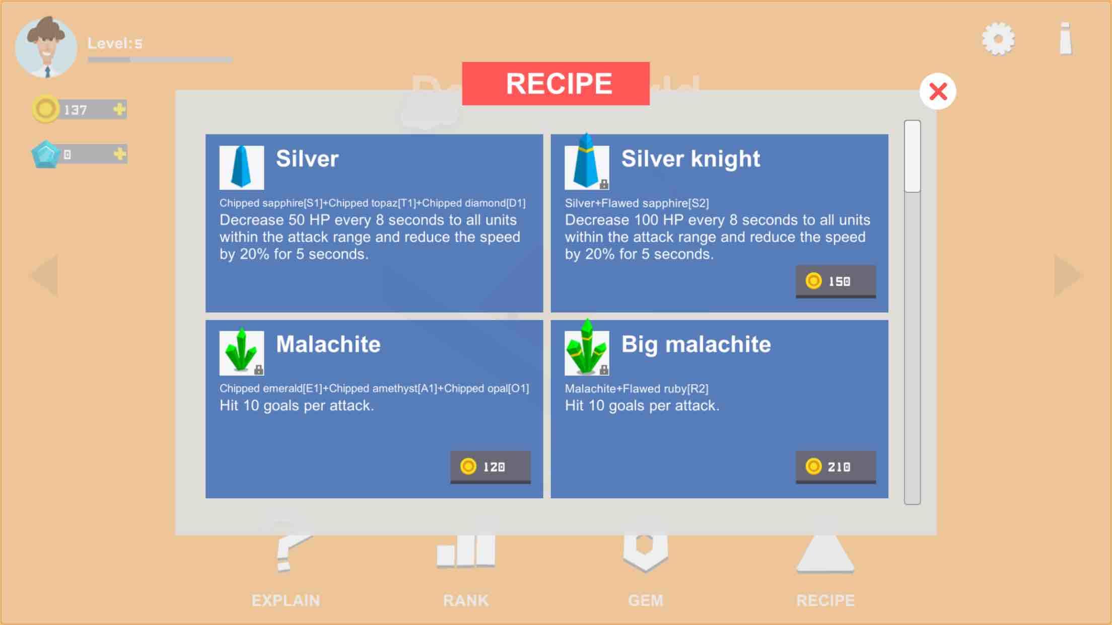 宝石防御是一款益智塔防游戏,超级考验脑力的游戏,上手会比较难,需要会摆放,会造迷宫,会合成,会搭配宝石,不是很休闲,不过深入进去,你会发现它的魅力,推荐给大家。