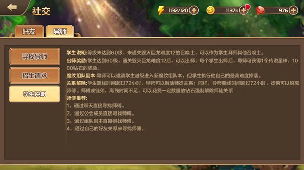 想找学生的玩家只要在等级达到60级且通关毁灭巨龙难度12后,即可发布招生信息,被系统推荐给没有导师的玩家。而等级较低的玩家想要得到帮助,只要点击“寻找导师”,就会得到系统推荐的导师以供选择,并有包含导师等级、名字、活跃度、在线离线状态的相关信息作为参考,双方都同意则师徒关系成立。