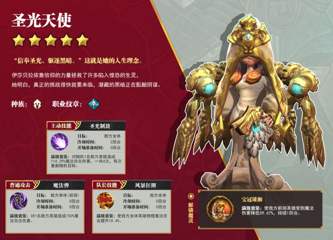 圣光天使是平民玩家比较容易获得的五星强力英雄,多段伤害的技能特性特别适宜与能制造折磨效果的英雄进行组合,在获得其他五星英雄之前,搭配合适的四星紫色英雄也可发挥出强大的战斗力。