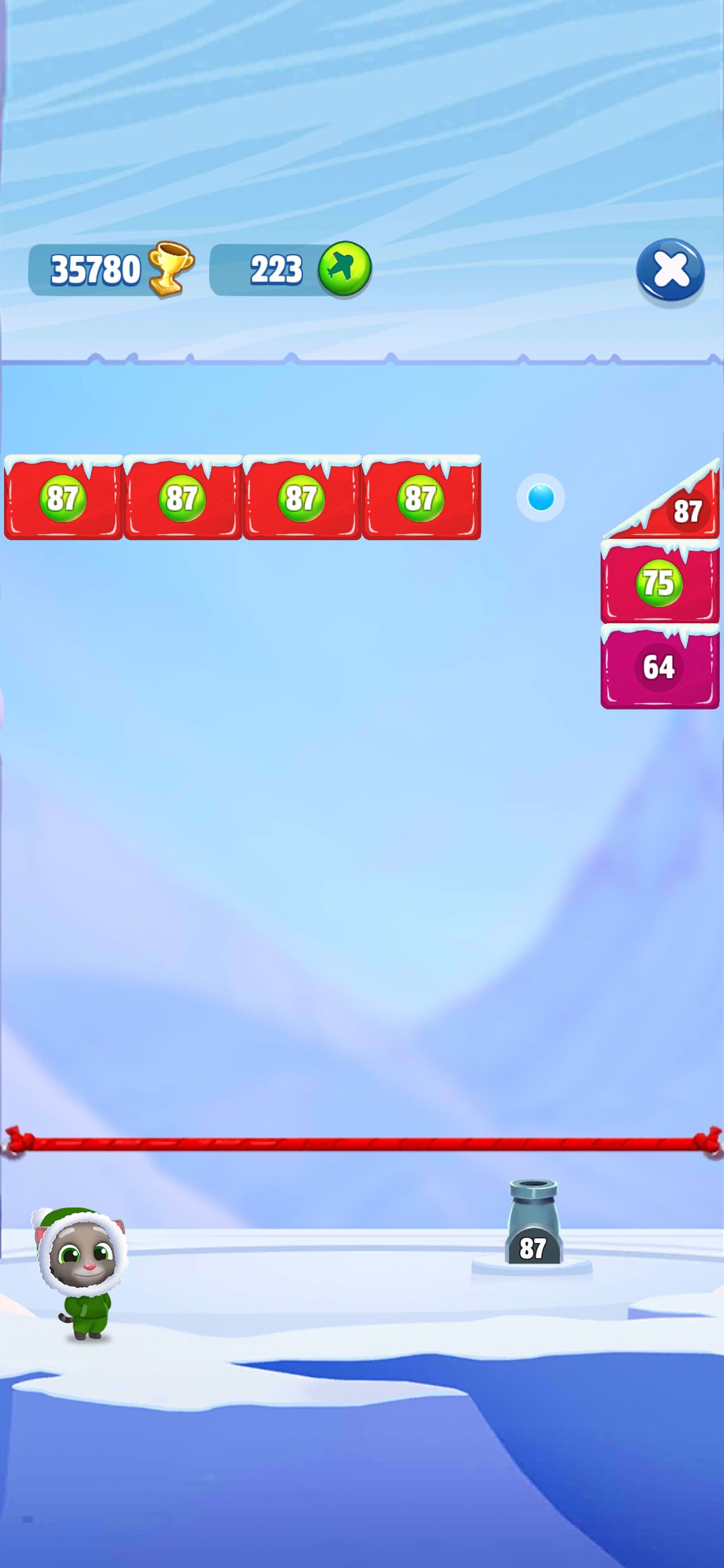缺点:( 声明:不是吐槽游戏是建议,由于还在测试阶段,进行游戏游玩后问题反馈)缺点一,游戏可玩性低,导致不适合大部分玩家,缺点二,游戏内设道具不足导致玩家兴趣低落,以图为例 前期虽有道具并且可发射炮弹与最小方块上最大数值成正比但随着数值普遍达到70后难度逐渐增加,缺点三,数值增加至80后方块同屏数量逐渐开始变态使得玩家勉强应付,可提供道具不出现不合理没有随着难度增加而增加,以图片为例:出现特大方块后游戏难度随着最大方块数值变化而呈现指数级爆炸增长,缺点四,游戏内虽设有特殊道具但没有随着难度增加而增加反而让玩家对于游戏体验出现糟糕情绪。建议:致开发团队,一:游戏玩法大体不需要调整 游戏模式可以增加些趣味玩法 比如增加难难度增长后弹珠弹跳多少下后会触发一定效果进行辅助玩家清除 从而达到增加游戏趣味性,或者弹珠弹跳多少下后在下回合出现随机炮弹等,二:希望开发团队能做些与小猫进可行互动的一些场景 比如在连击多少下后会表现开心或者鼓励的姿态 从而增加玩家的兴趣及乐趣 如上:只发现部分问题如有错误希望指正!