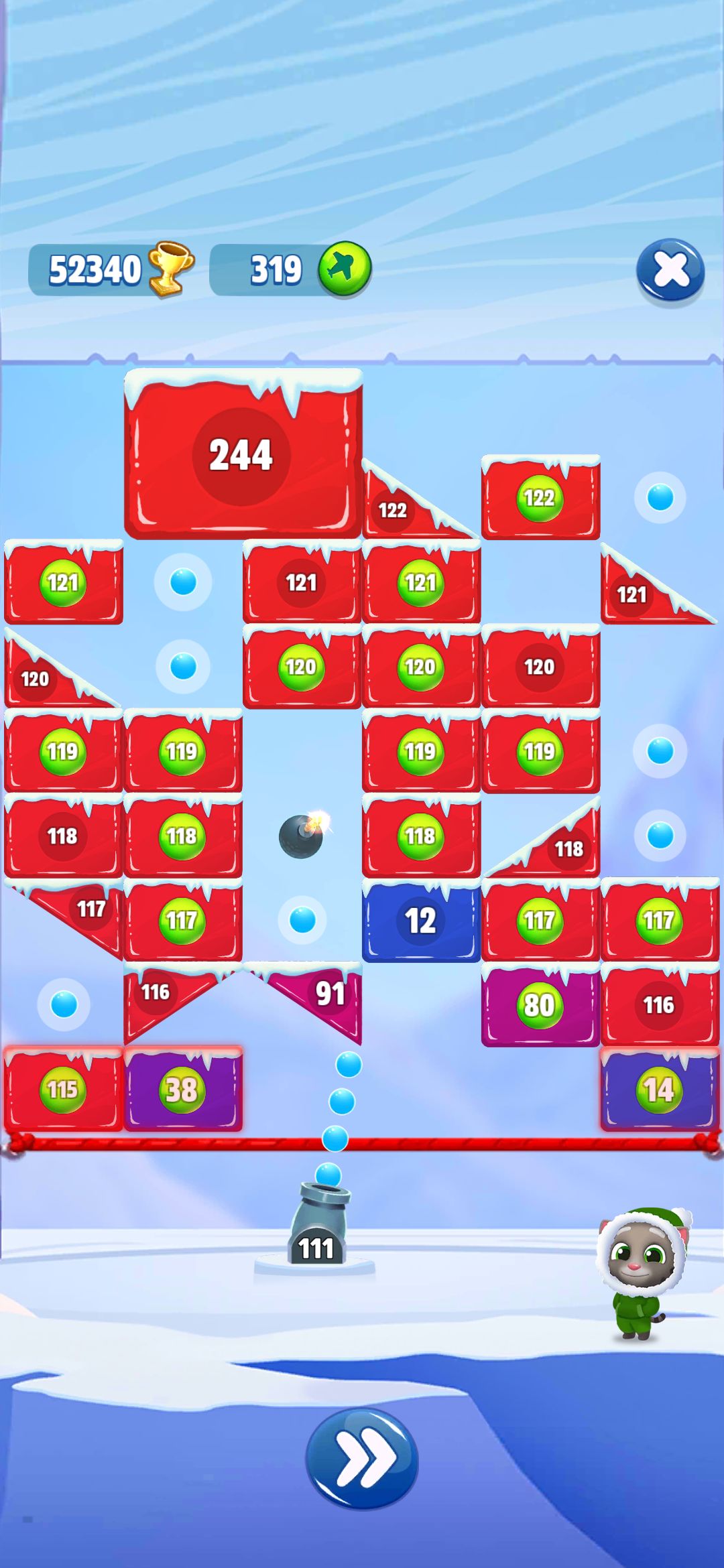 优点:碰碰冰模式在游戏特点上增加元素,使玩家刚接触时很新颖,游戏教学简单容易上手,亮点一,游戏增加道具火焰球使得破坏方块更加快速,亮点二,游戏内设爆破道具,和雷电消除整行道具使得游戏难度大大降低,亮点三,游戏内可发射炮弹与最小方块最大数字一致。