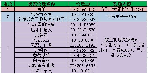 《音乐少女》第一期“歌王大比拼”及“谁是幸运的天选少女”活动已于2019年3月10日23:59分结束。经过我们的努力获奖名单已整理完毕。为了保证各位可以尽快领取奖励,请及时使用获得的论坛昵称和ID在本帖下回复活动名称和您的QQ号码,以便我们为您登记领取奖励哦~~~