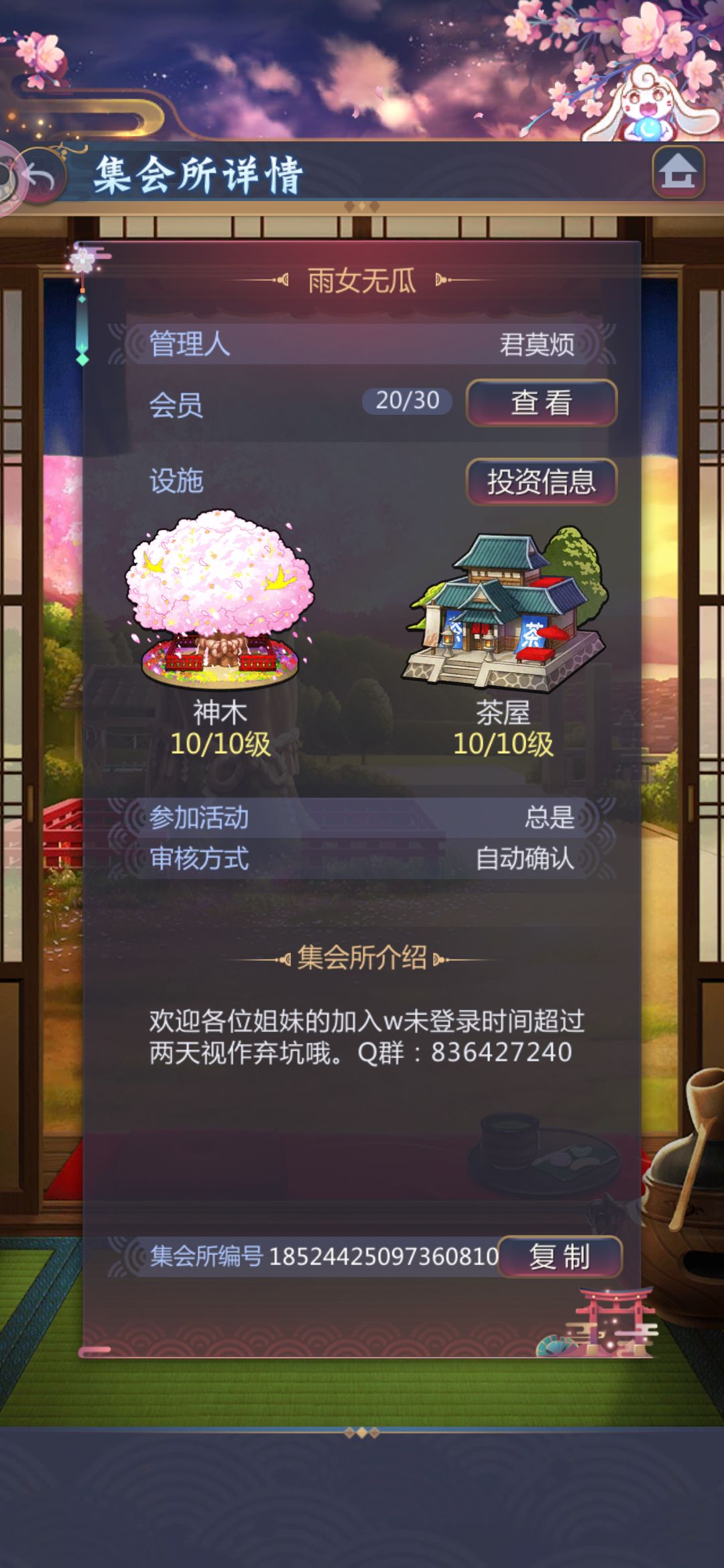 18524425097360810帮集会所招人呀!满级设施,活动总体中等肝度,比较肝的姐妹也有,球球聊天,气氛友好,马上要开花宴了,加个活跃会所拿奖励呀姐妹们!