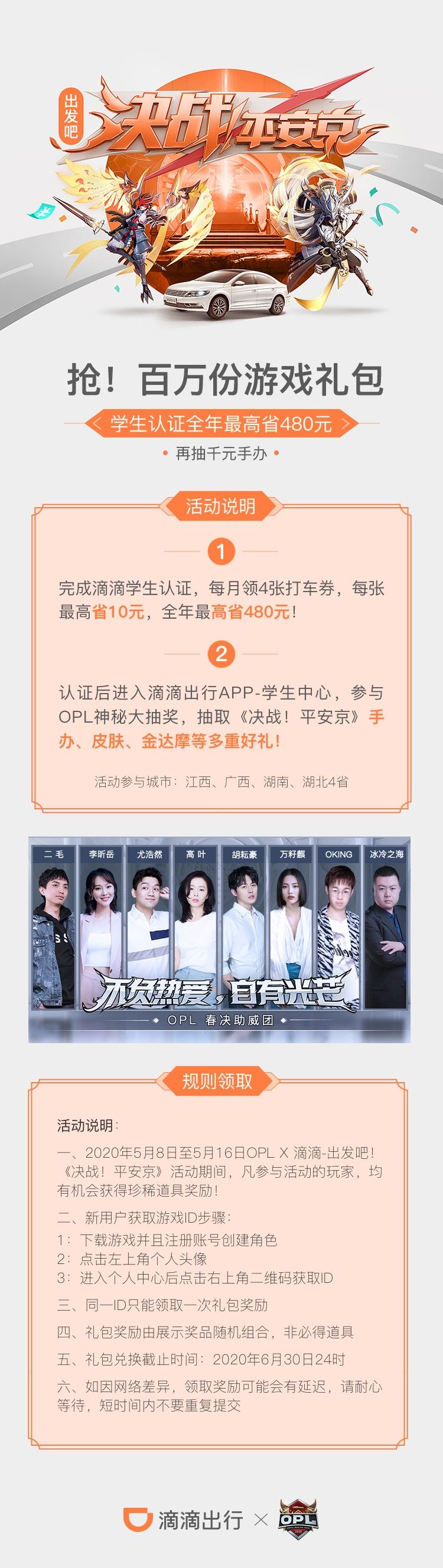 除此之外,从5月8日起至5月16日,凡参与活动的玩家都会机会获得珍稀奖励,百万份游戏礼包等你来拿!完成学生认证后进入滴滴出行APP-学生中心,即可参与OPL神秘大抽奖,抽取千元手办、游戏皮肤、金达摩等多重好礼!