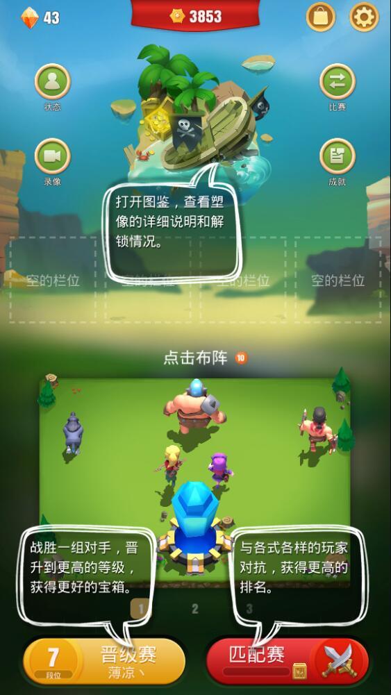虽然极大的降低了游戏的操作性,却没有影响整个游戏的体验性。把更多的时间留给玩家去思考对战阵容的分布和英雄的选择。玩法上,除了匹配玩家的PK模式外,游戏加入的段位系统,用于解锁其他更高级的英雄。匹配获胜的奖励宝石和宝箱,宝石可用来购买商城里其他英雄。宝箱可以开出英雄。双向成长的渠道,可以让玩家更快的提升自己的能力。以便在匹配系统中展示出更好的表现,冲击排行榜的名次。