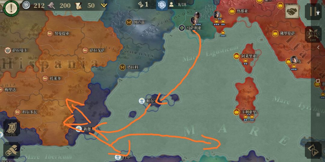 南高卢+凯尔特部落进攻图:帕尔岛–新迦太基,新迦太基升5级招募士兵,任命将领,之后分推伊比利亚和迦太基就行了,占领迦太基后,派兵驰援东方就行了。