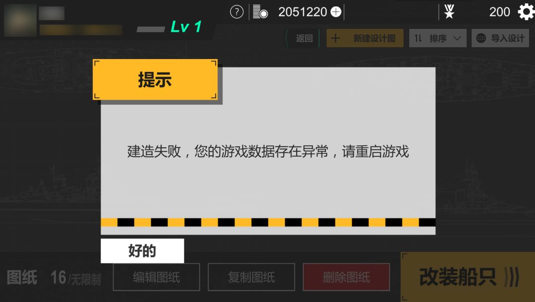 还有一点需要注意的是,如您没有将同名舰船进行过任何改造便直接点击改装船只按钮将会出现建造错误,同时在缺乏足够资源点时进行船只改造操作也会造成建造失败。(在缺乏足够资源点时进行船只改造操作后船坞内原有舰船将会消失的问题已被确认为BUG导致,建议各位提督在发布紧急修复版本前切忌在资源点不足的情况下进行舰船改装。)同时也有其他各种原因会造成建造错误。请格外注意。