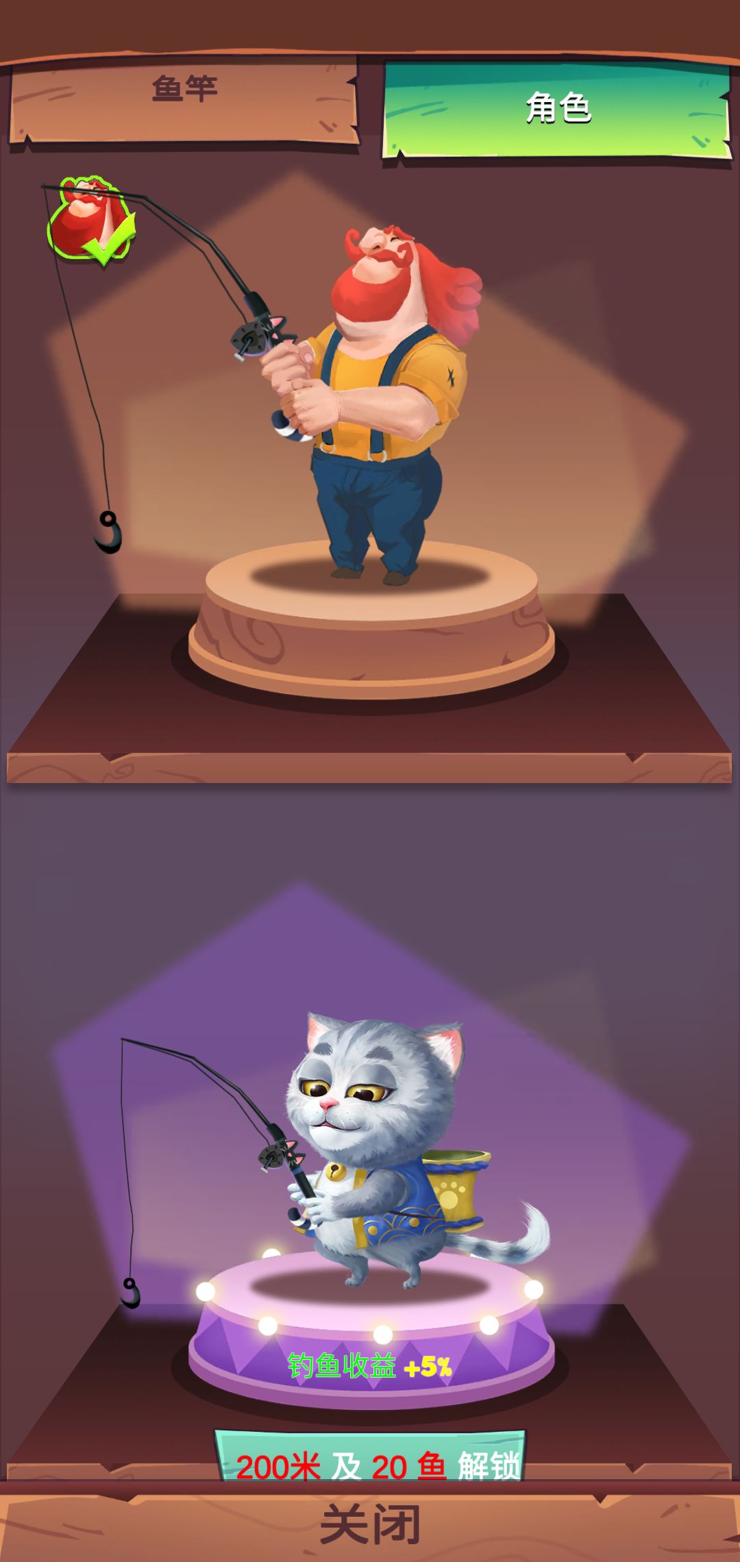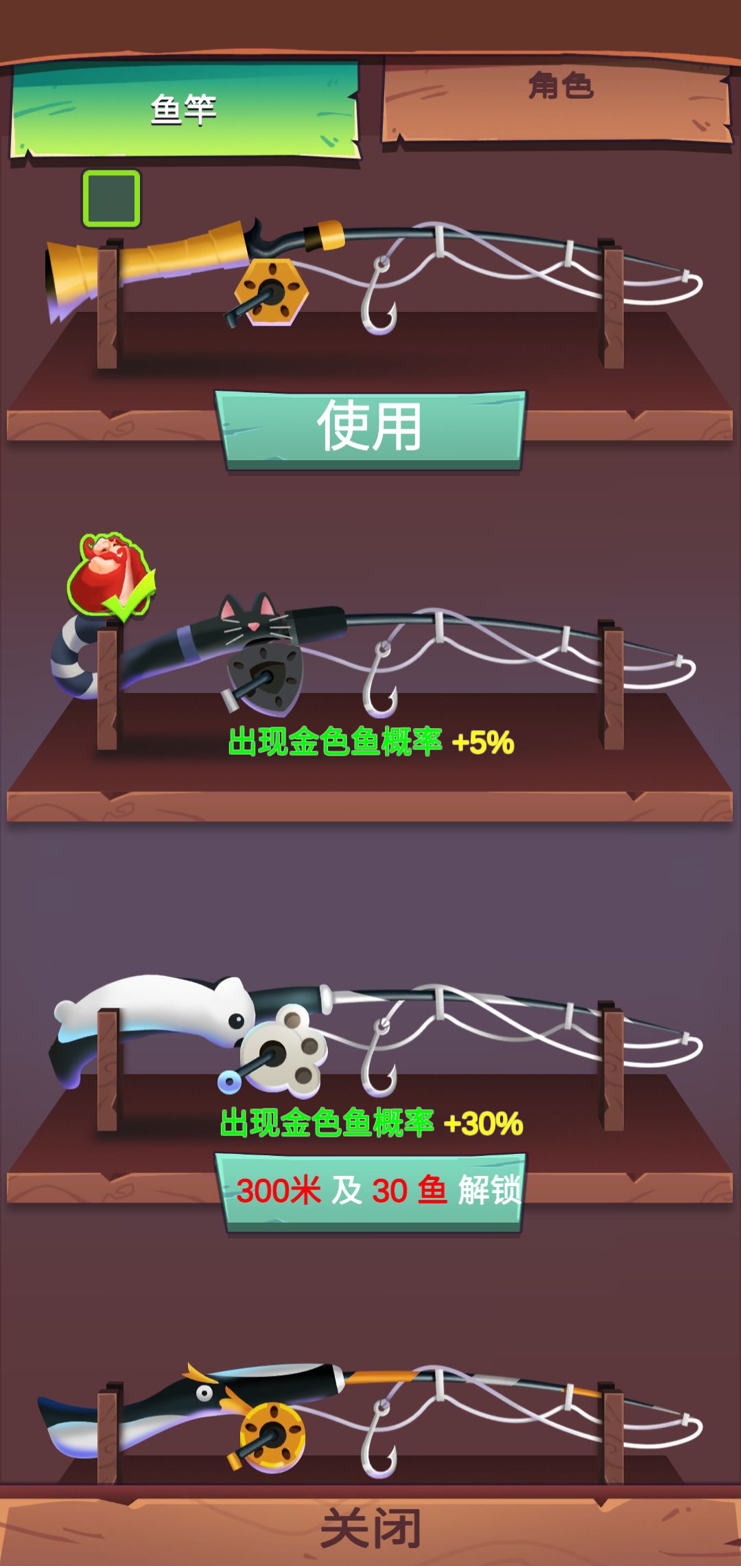 游戏画面的左上角为目前钓到的鱼品种,有普通和稀有两大类,钓到的鱼类会以彩色展现出来,没钓到的鱼则以黑色无图像展现,暂时无法看清是什么品种,但是作为稀有品种来说,其实也就是普通鱼类的金色样子罢了,但是钓上来的金钱也会多很多哦。 游戏画面的右上角则是道具选择,里面有鱼竿和角色两大类,分别通过达到条件进行解锁,当然,解锁的鱼竿比原始获得的鱼竿要增加属性,例如出现金色鱼的概率增加,钓鱼收益增加等。