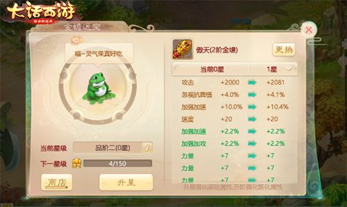 培养金蟾需要消耗灵气果,当玩家的每日活跃度达到150之后,可以在金蟾大仙处领取1次奖励,并可以在品阶对应的商店兑换灵气果。玩家喂食金蟾灵气果后,将增加金蟾的灵气值,灵气值的增加可以提升金蟾的星级和品阶,进而提升小金蟾吐出的装备的数值。金蟾培养并非一蹴而就,耐心培养才能得到更加强力的装备!