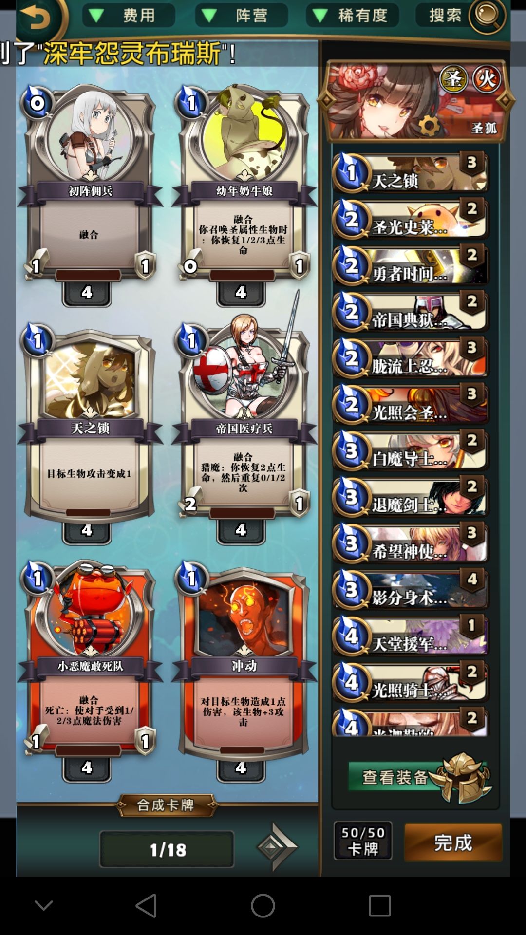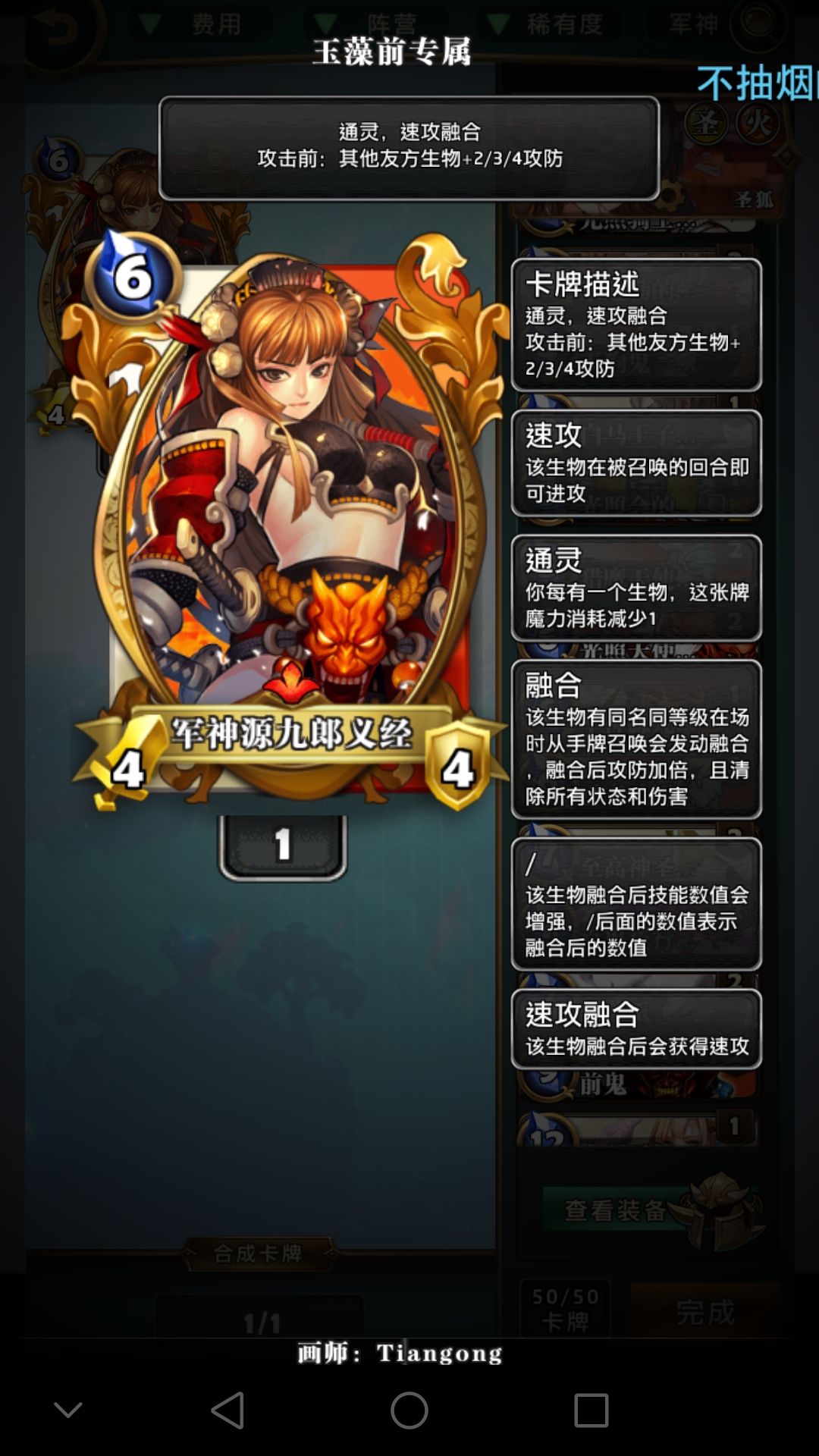 后面随便补一补前鬼呀,哈姆雷特呀之类的就赢了。各位都知道狐狸圣天使打法的主要强势期在五费以后(均势情况下,你五费前铺满场并且保住了当我没说),是很晚的了,所以我只在第二阶段说了一下怎么在快攻面前苟住争取翻盘,我也有试过快攻狐狸但是咋说呢,感觉也没多快,还不如愉快的铺场。(补充一下,我带的装备是让源九郎义经来快一回合打被动的,稳一点的话带圣属性加一那个就好了)。总的来说这套牌组需要一些经验(当然现在没经验的人也少)来预判一些aoe的牌比如契约胜利之剑之类的来维持优势和主动权。其他的也没啥,主要是以人多和即时加强来获取优势并一路走向胜利。丝毫没有娱乐性,记住,没有。因为要随时小心对方的AOE,可以说是会打的非常累。速度的话看前期有没有优势,有的话一般都八费左右就解决了。没有甚至劣势,可能就要靠你手里剩下的分身,百鬼夜行,和前鬼来翻盘了。至于为什么一直没说尾兽玉,因为尾兽玉就是个礼花,对,没错,礼花,赢了来一个庆祝当烟花(用作斩杀),输了也来一个当遗书(艺术就是爆炸