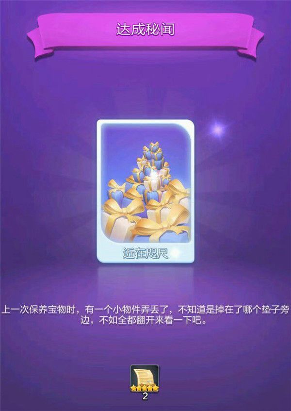游戏内秘闻“近在咫尺”的完成方法:点击收藏室内的五个宝物垫,当所有宝物垫均触摸完毕之后,就会触发隐藏秘闻“近在咫尺”啦。
