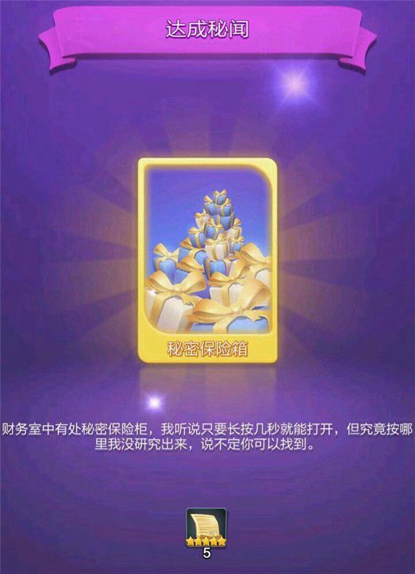 游戏内秘闻“秘密保险箱”的完成方法:长按财务室的美元符号按钮持续4秒,游戏界面会出现保险柜被打开的动画并给出4秒时间提示。