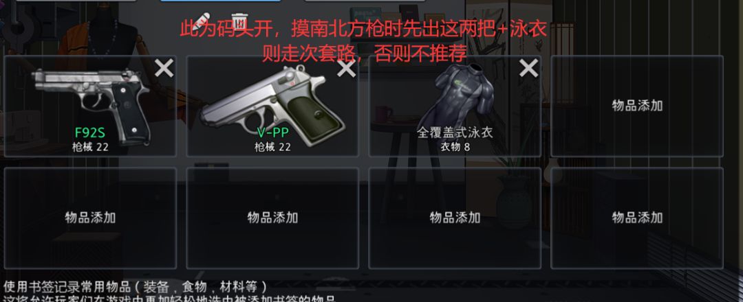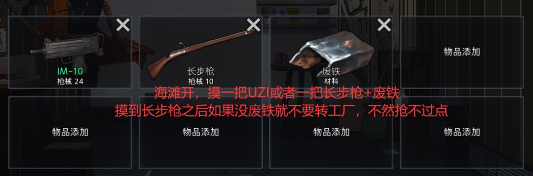 开局海滩,摸一把uzi(im-10)或者长步枪+废铁。再摸个泳衣,图中忘记加上泳衣了