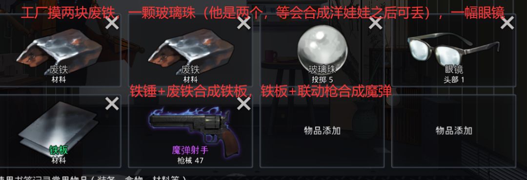1,跳工厂:摸两废铁,眼睛,玻璃珠,如果同时来望远镜+激光笔,可以不摸珠子,直接做狙击镜,但是如果想贪,还是可以摸