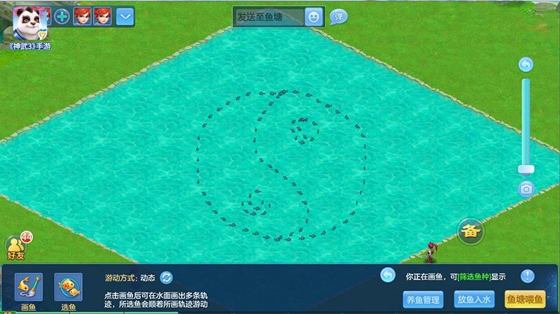 在养鱼过程中,少侠还可以和鱼宝宝进行互动——双击河流水面开始养鱼,在养鱼视角下可以进行放鱼、喂鱼、画鱼等诸多互动,不仅可以把鱼宝宝驱赶到一起喂养,还可以把河流水面当作画板,指挥鱼宝宝顺着所画轨迹进行游动,轻松表演各种团和字样的游动轨迹。