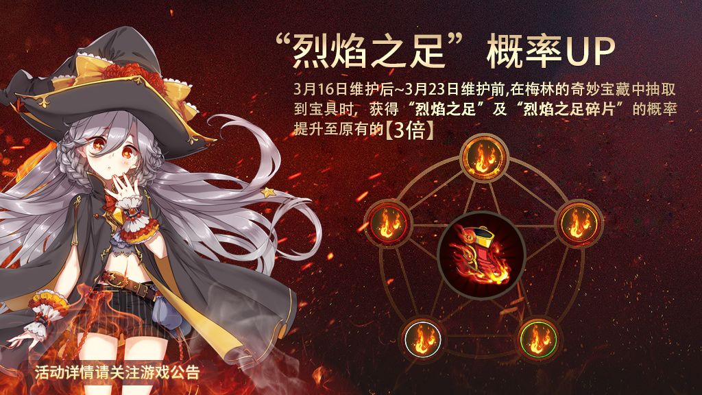 活动内容:活动期间,在梅林的奇妙宝藏中,获得宝具「烈焰之足」以及宝具碎片「烈焰之足碎片」的概率提高到原有的3倍!