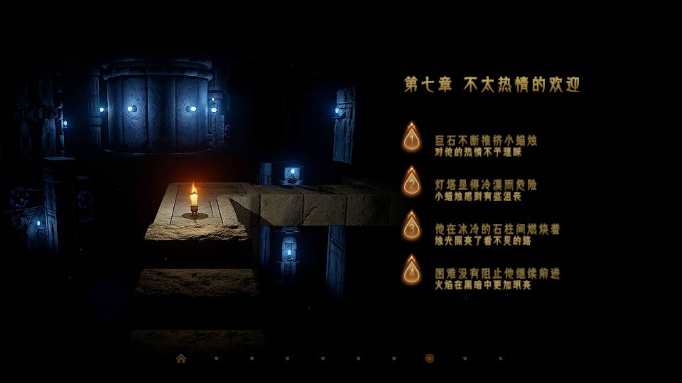 睡不着了,说点心得吧,这蜡烛我是当打火机用的,大部分情况下只点一瞬间的火,足够记路况和一部分机关的触发了。关于收集,任何能走的地方都要走一下看看,不会死的前提下把所有暗处都照一下,不用担心烧没,我基本都是烧光之前就掉坑/被干掉了,9-3是个例外,boss会烧你……