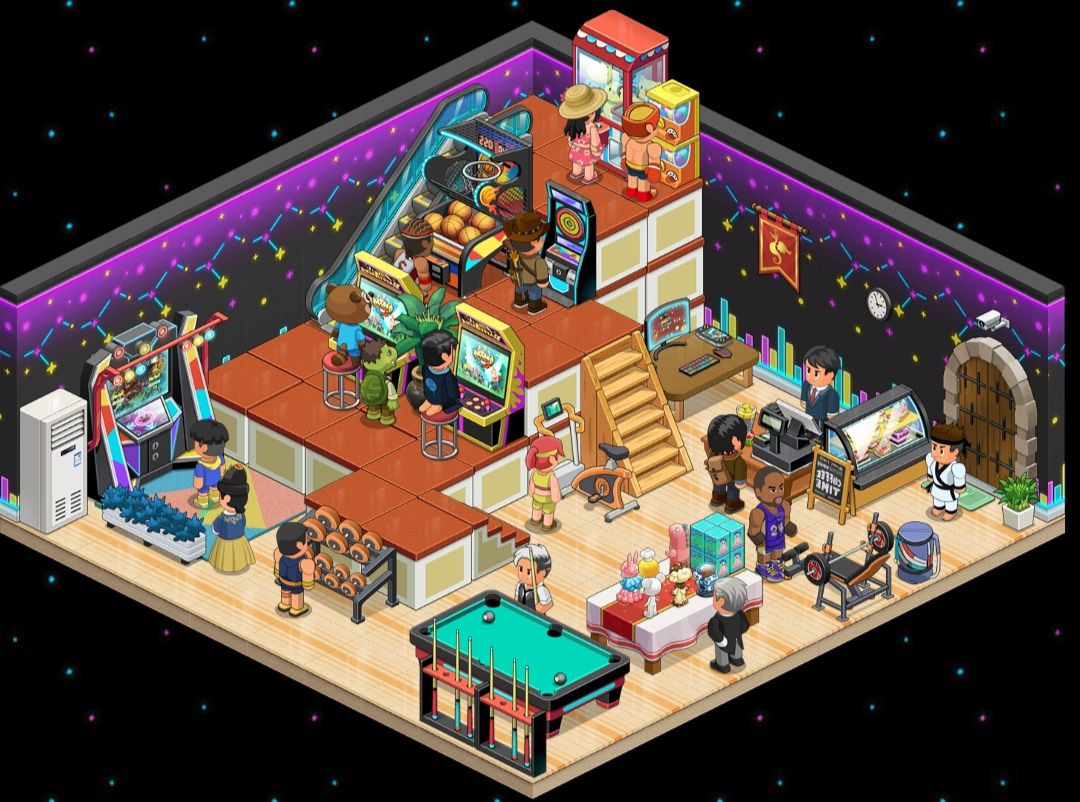 一层:奶茶小店,杠铃区,桌球区,跑步区,举重区,跳舞机以及一个礼品兑换处
