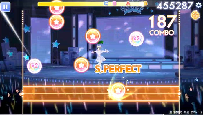 咱们结婚吧这首歌的S评价条件需要364819分,这里技能选择极限增强,并最终达成ALL COMBO的情况下得分为587628分,二者的分差大约为22分。可以说咱们结婚吧这首歌在第三章中,是对玩家音符的准确度要求比较高的一首,下面就给玩家介绍一下这首歌的几个音符难点。