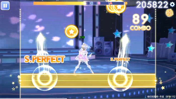 咱们结婚吧歌曲的中间部分,还会出现双按普通音符,这里同时还会出现其他类型的音符。应对这个音符的时候,双按音符需要注意双手的同步率,这里双按音符与其他音符的间隔时间比较大,跟随背景音乐节奏可以保证S.PERFECT的节奏点。