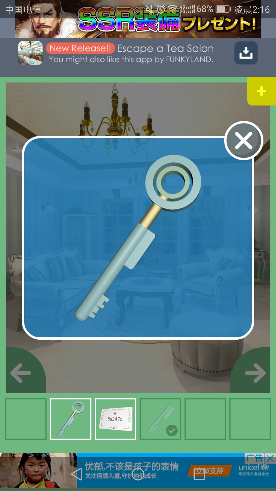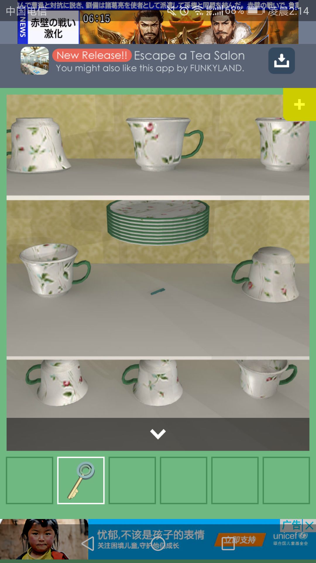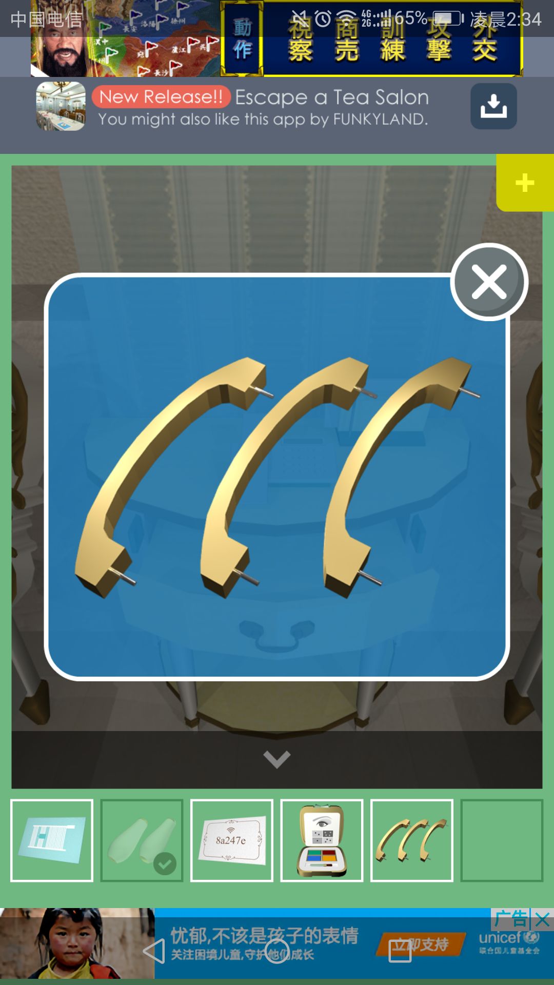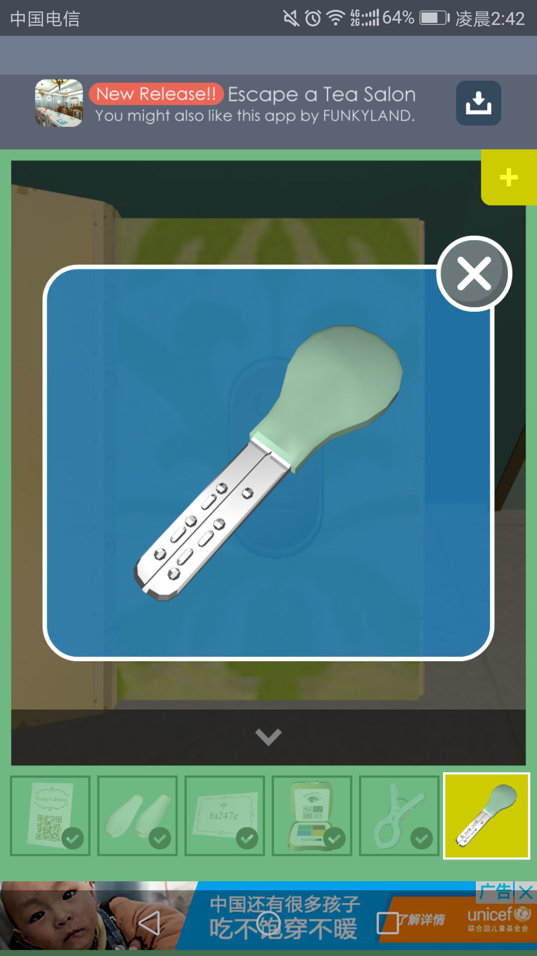 钥匙可打开放置茶杯的柜子,点击中间的盘子,得到一根小铁管。