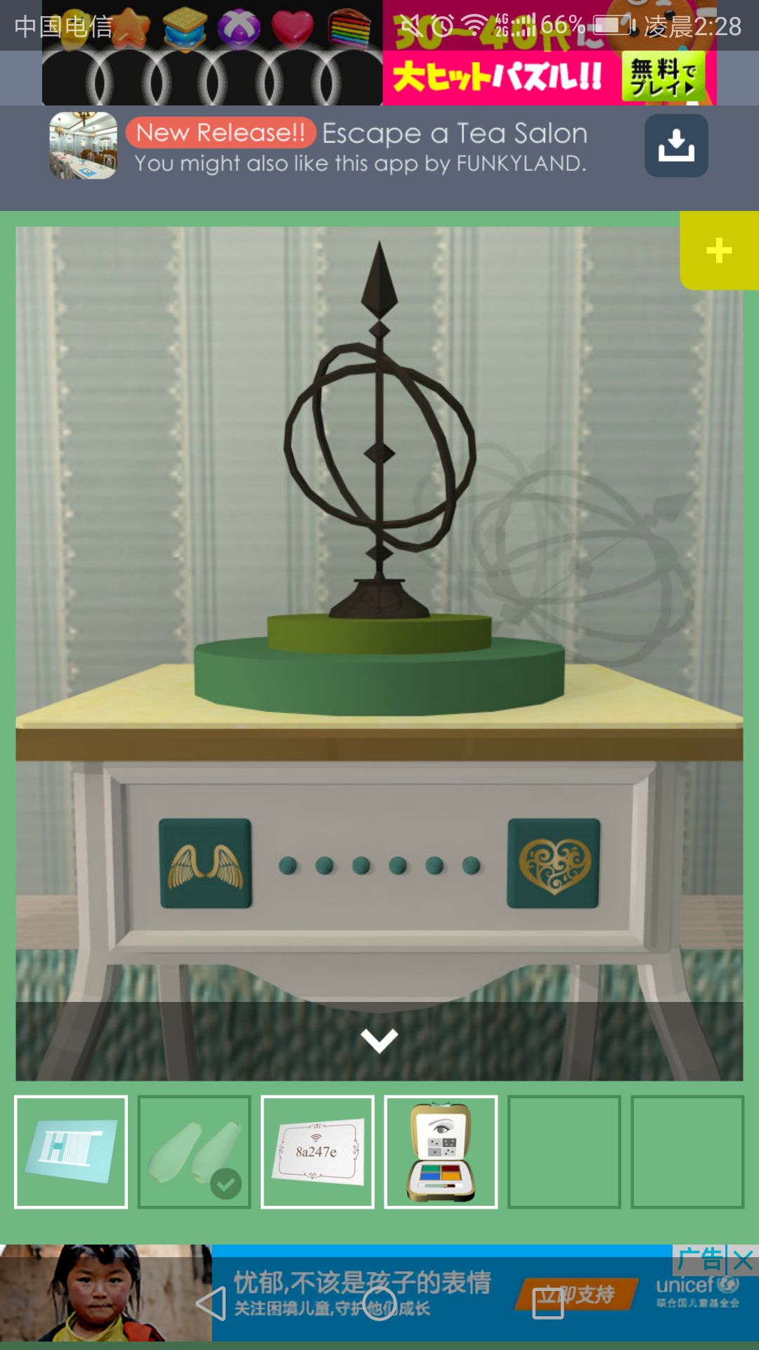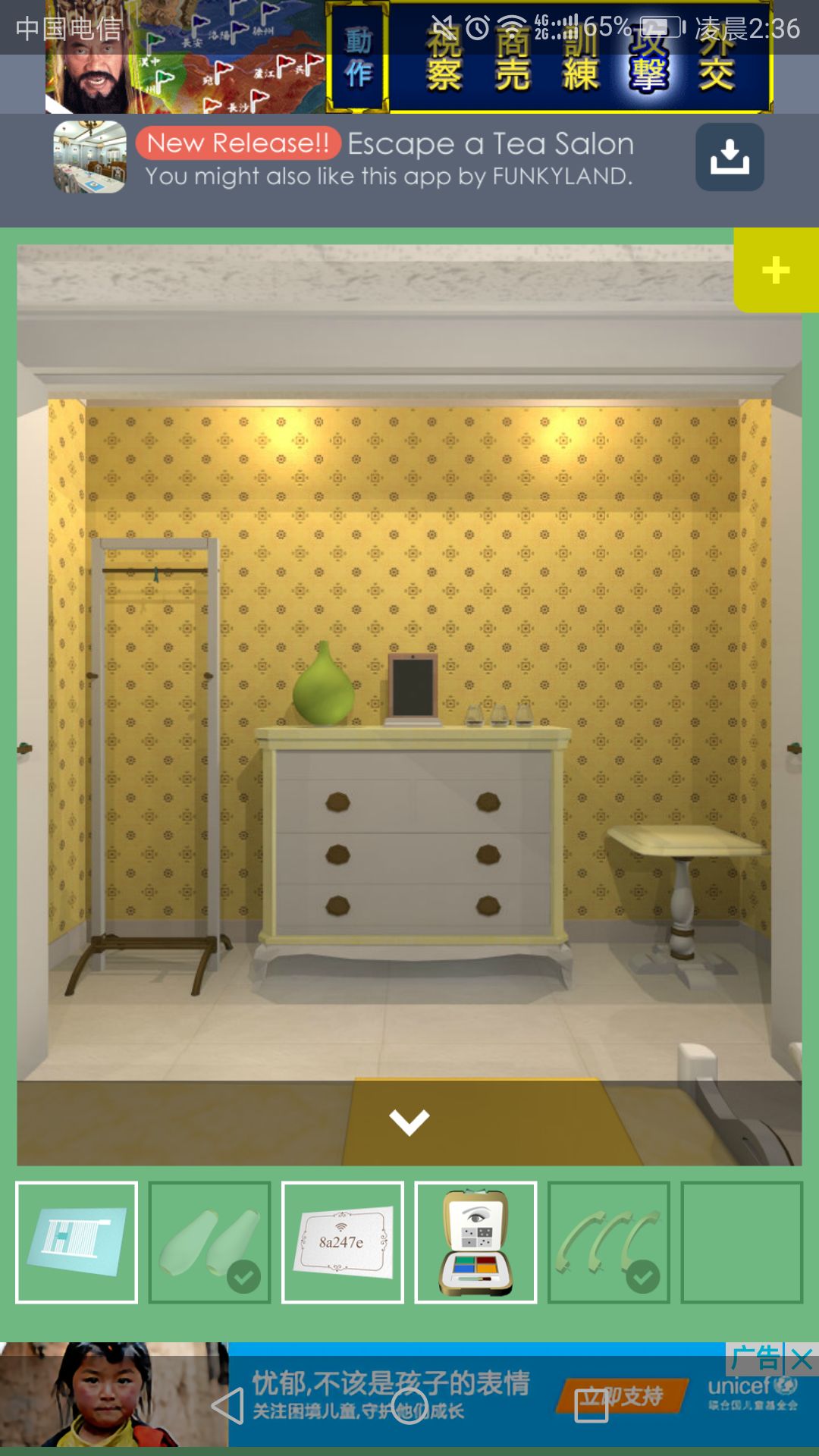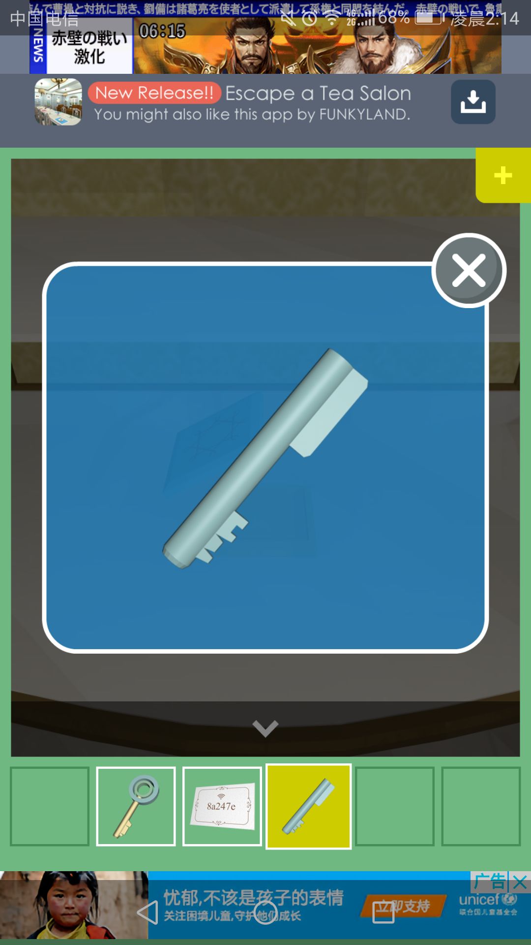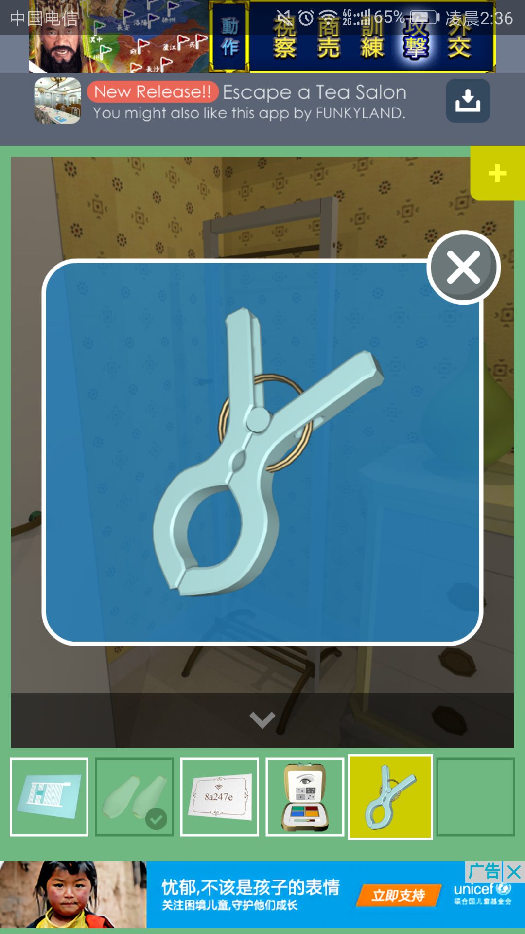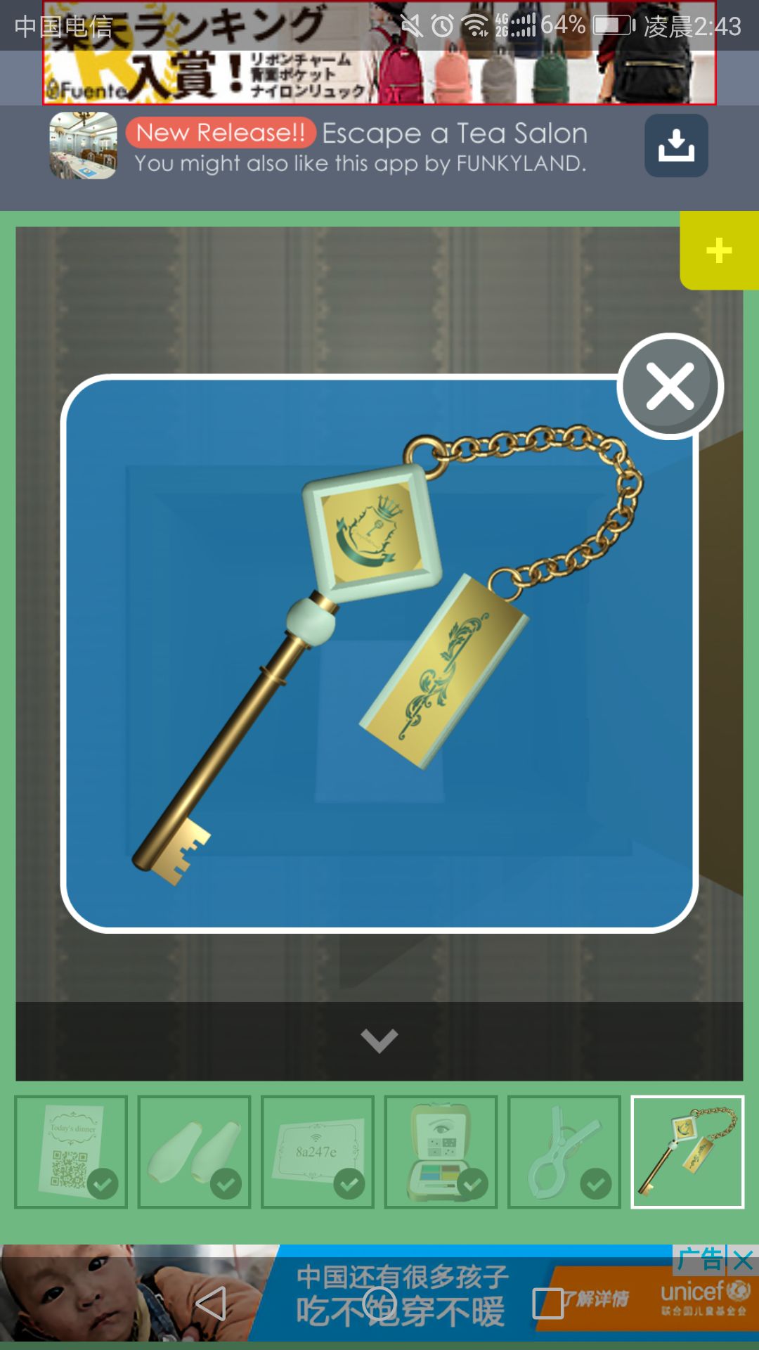 钥匙可打开放置茶杯的柜子,点击中间的盘子,得到一根小铁管。