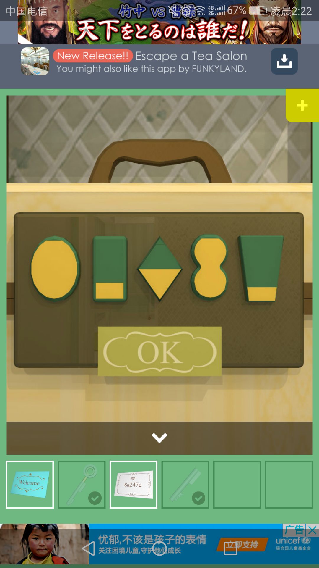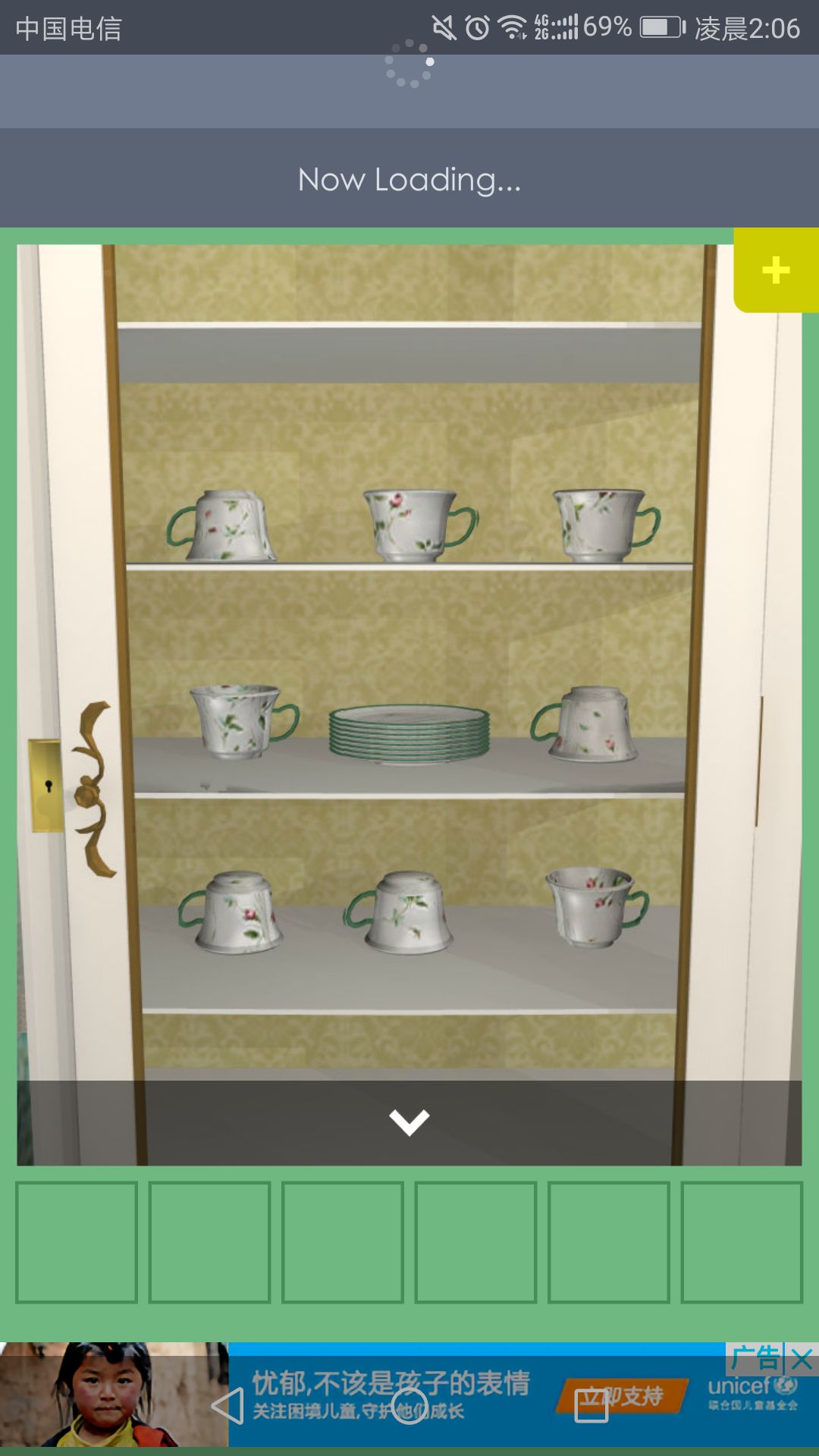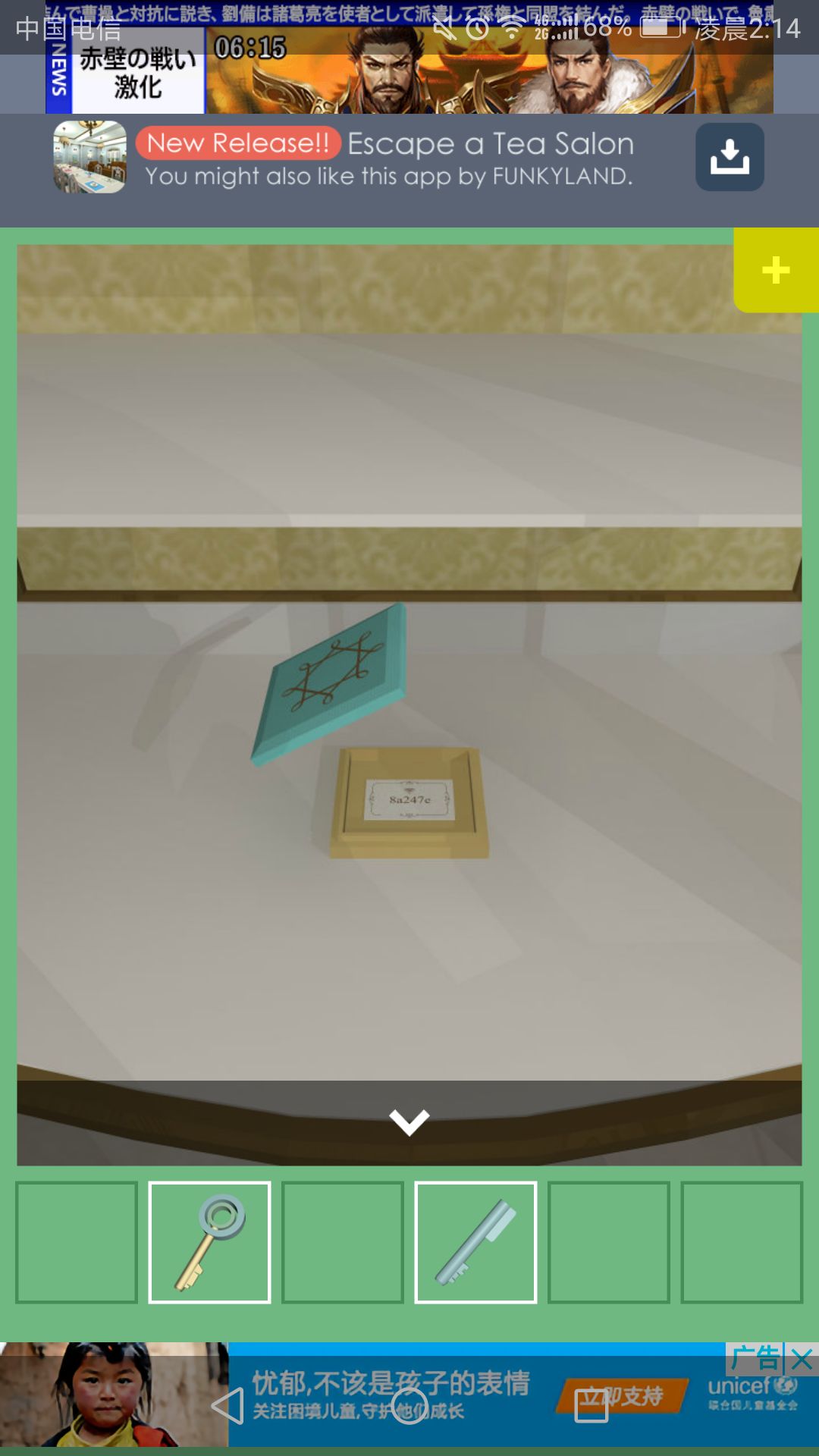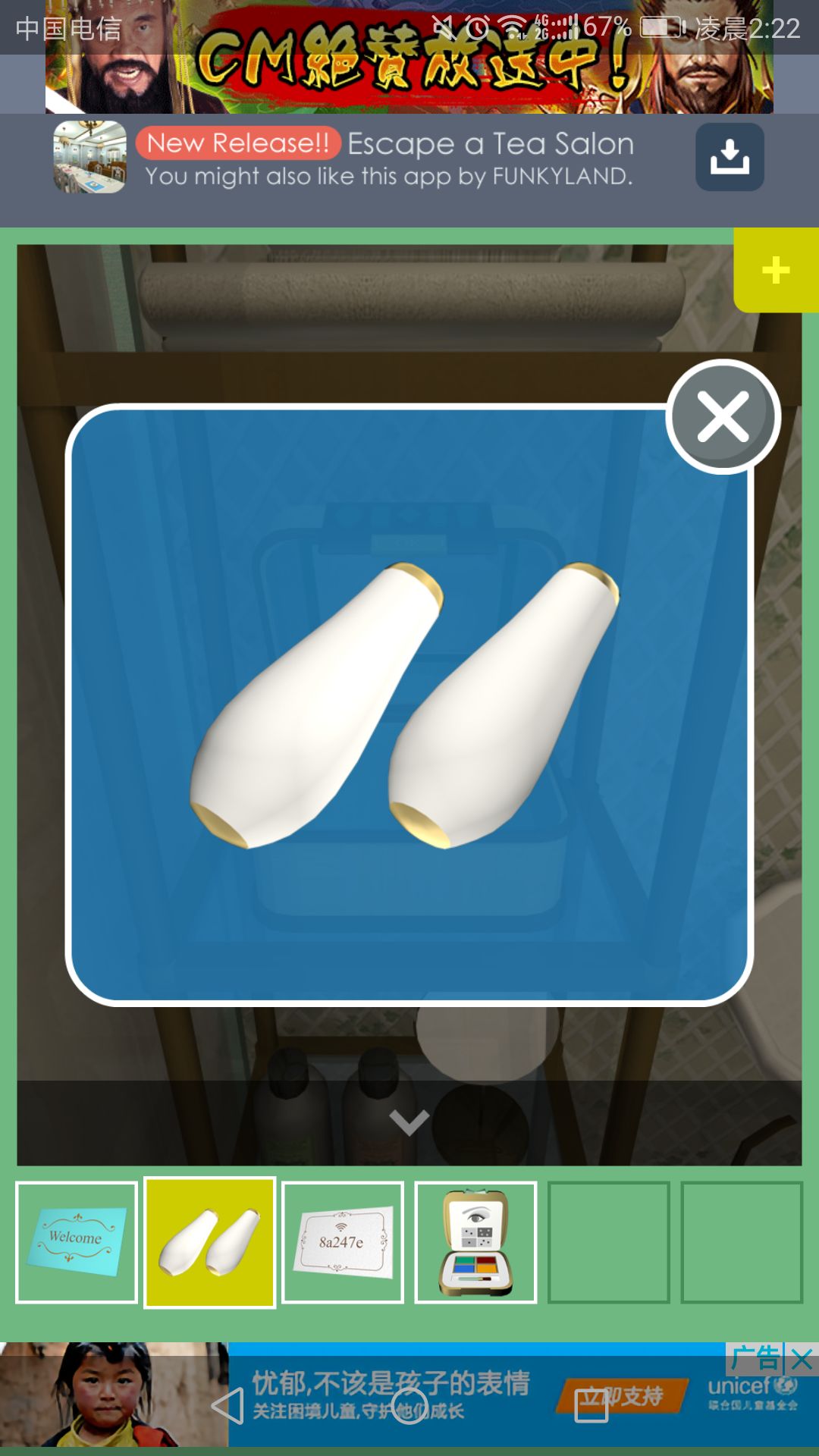 钥匙可打开放置茶杯的柜子,点击中间的盘子,得到一根小铁管。