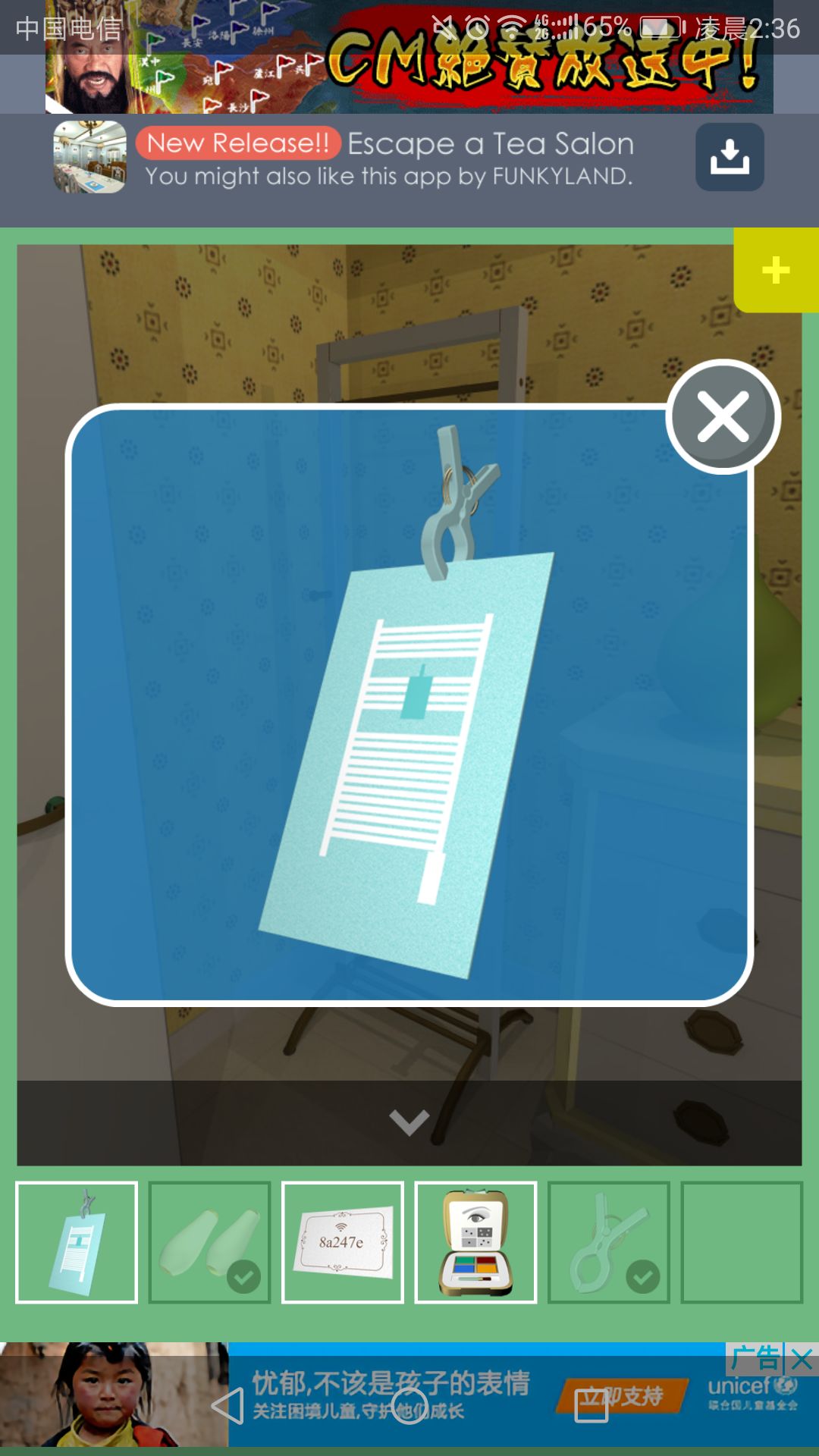 打开门口点击左侧架子,得到夹子一个,点击夹子与先前得到的蓝色卡片组成新卡片