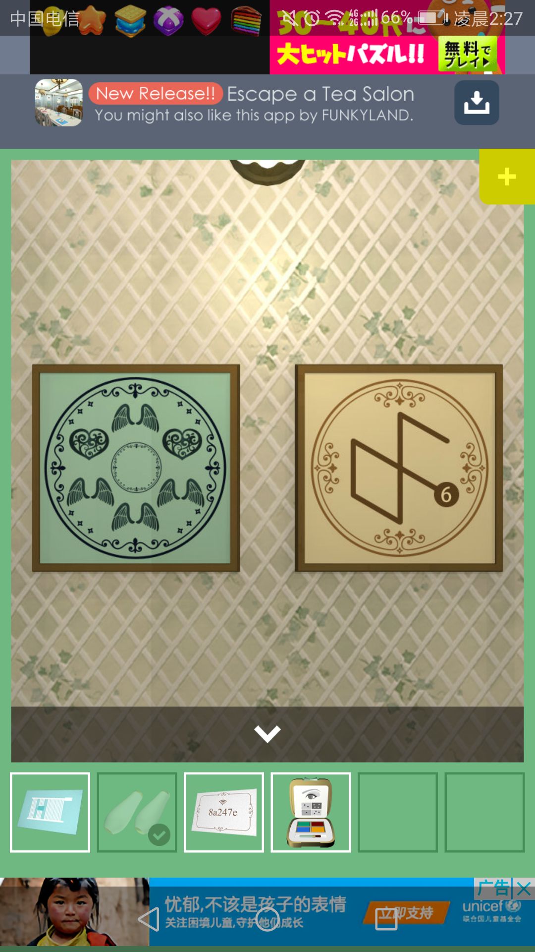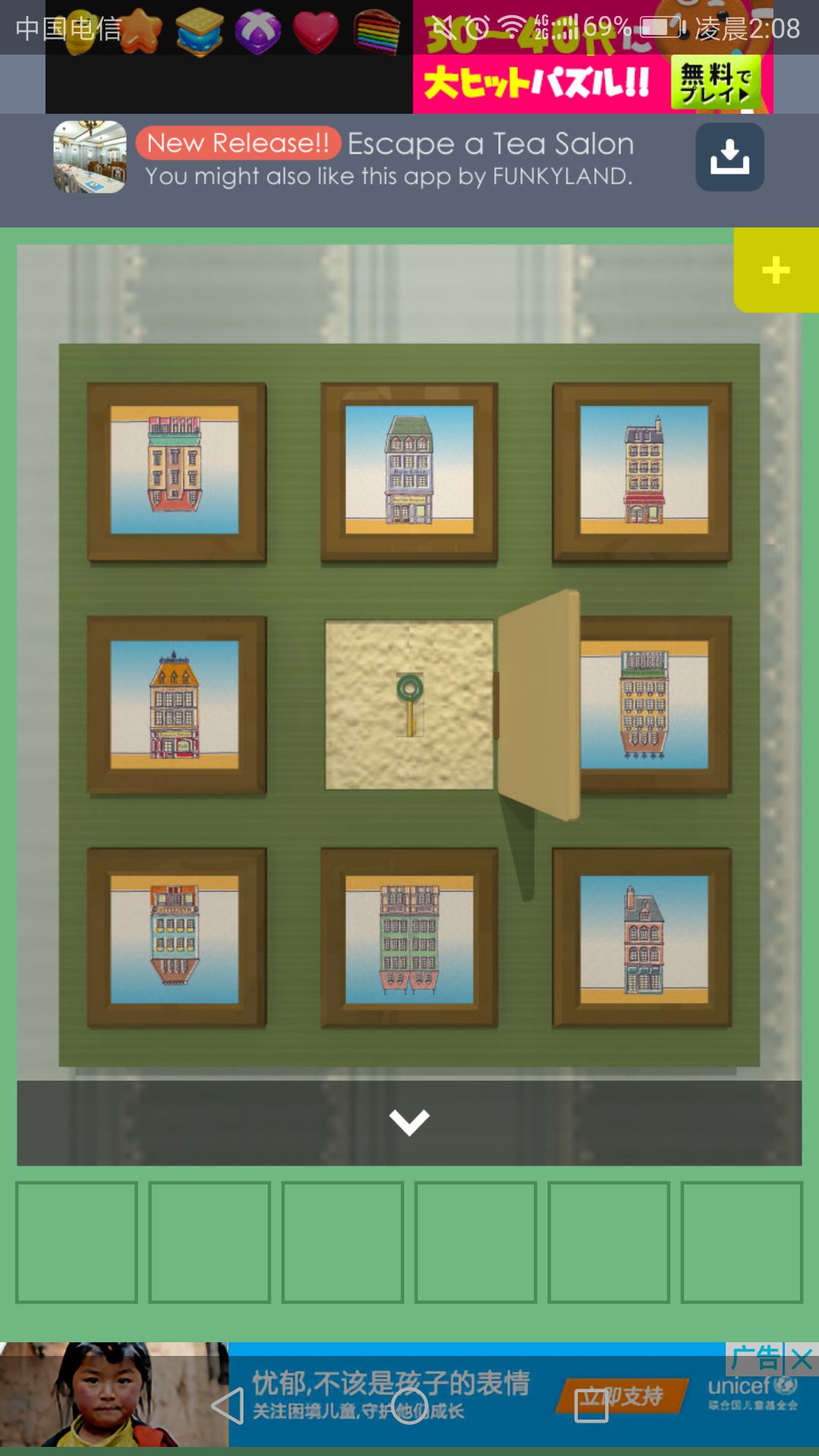 进入右侧房间,点击左侧墙上的画,点击图中建筑物,颠倒成与柜子里的茶杯一样的摆放,得到钥匙。