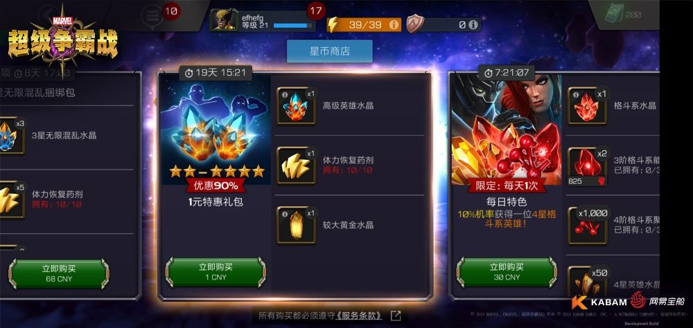如果错过登录活动的话,也没关系.8月7日星币商店内还会上线为期一周的一元礼包活动。一元礼包的奖励包括:体力回复药剂、高级英雄水晶、黄金水晶,该礼包在活动期间仅限购一次,机不可失,时不再来。请各位征战在漫威宇宙的召唤者抓紧这次机会,获取自己心仪的道具。