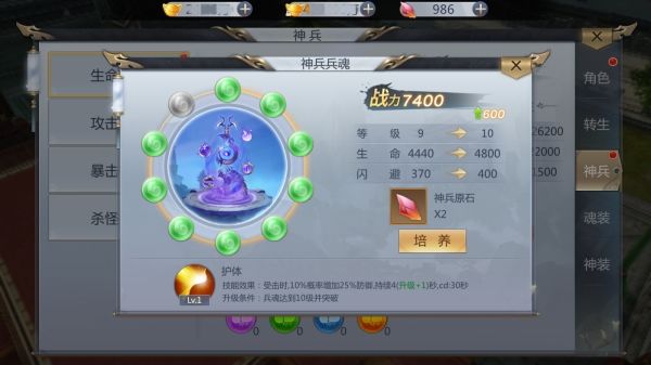 3)兵魂激活之后,消耗材料培养,培养增加属性值。