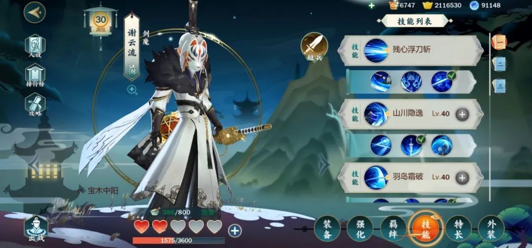 二技能一般会在断篇和绝章中选择,对空绝章对地断篇。三技能是一个被动技能,类似于一个单体的御,这里只推荐带残页,被击中可以连续触发一闪,也可以快速攒出触发技幻狼。