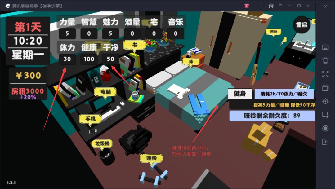 如此循环到大概23天应该就够还房租了,这时候是呆家里锻炼身体还是继续边赚钱边锻炼身体就看你自己选择了,力量到了150就可以跟着老大干了,老大不会亏待你,也是你接下来两个月的主要收入,尽早将房东拿下,才能避免疯狂涨工资。
