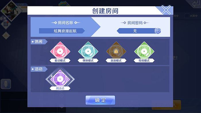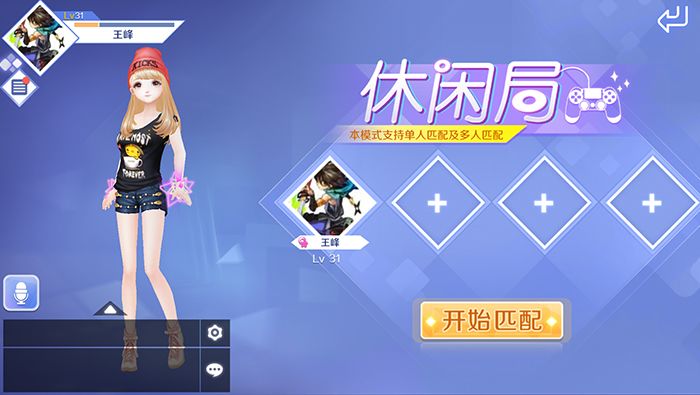 QQ炫舞手游除了对战中之外,休闲大厅中玩家可以自由创建房间,并邀请好友一起挑战所有模式歌曲,另外休闲大厅中玩家还可以参与周活动,获得丰富的服饰、道具奖励。休闲大厅中不仅支持歌曲挑战,玩家在创建好的房间内还可以进行互动,一起参与你画我猜、甚至还可以进行清唱K歌等。