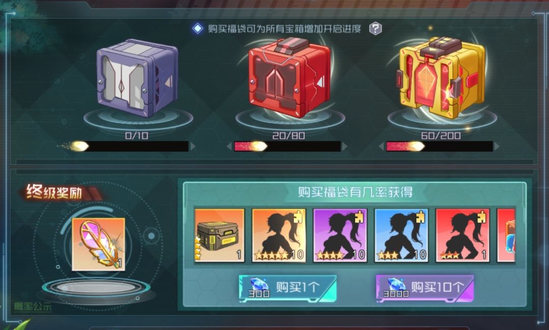5)迎春宝库:活动期间,每抽1次或10次,可为所有宝箱增加开启进度,达到一定进度值,即可选择对应奖励;8星英雄礼盒(开启后随机获得以下奖励之一:8星基因碎片*1,5星英雄碎片*50,4星英雄碎片*30),每10个8星英雄礼盒至少可以开出1个8星英雄基因碎片,10个8星基因碎片兑换任意8星英雄1名;
