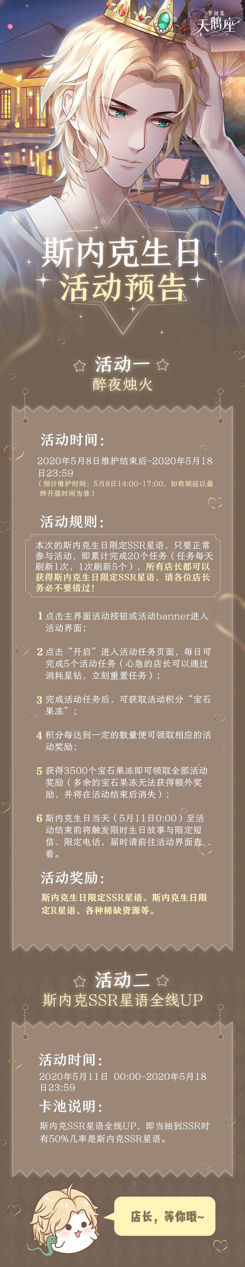 ★本次的斯内克生日限定SSR星语「此夜流光」,只要正常参与活动,即累计完成20个任务(任务每天刷新1次,1次刷新5个),所有店长都可以获得斯内克生日限定SSR星语,请各位店长千万不要错过!