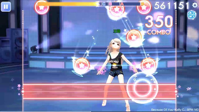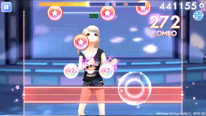 Because Of You歌曲刚开始从舞步就可以看出,这首歌的节奏非常的惊人。开头音符部分是普通音符上长按音符的基础循环,应对起来相对相对比较容易,在150个音符左右会出现密集滑动音符加上长按音符的循环,同时还有快速的双按音符夹杂其中。从250个音符开始就会出现密集的双按音符变奏,这里突然的音符改变容易出现MISS,尤其是夹杂其中的密集滑动音符。
